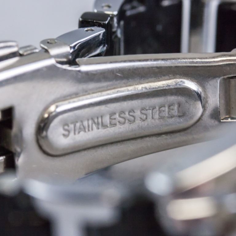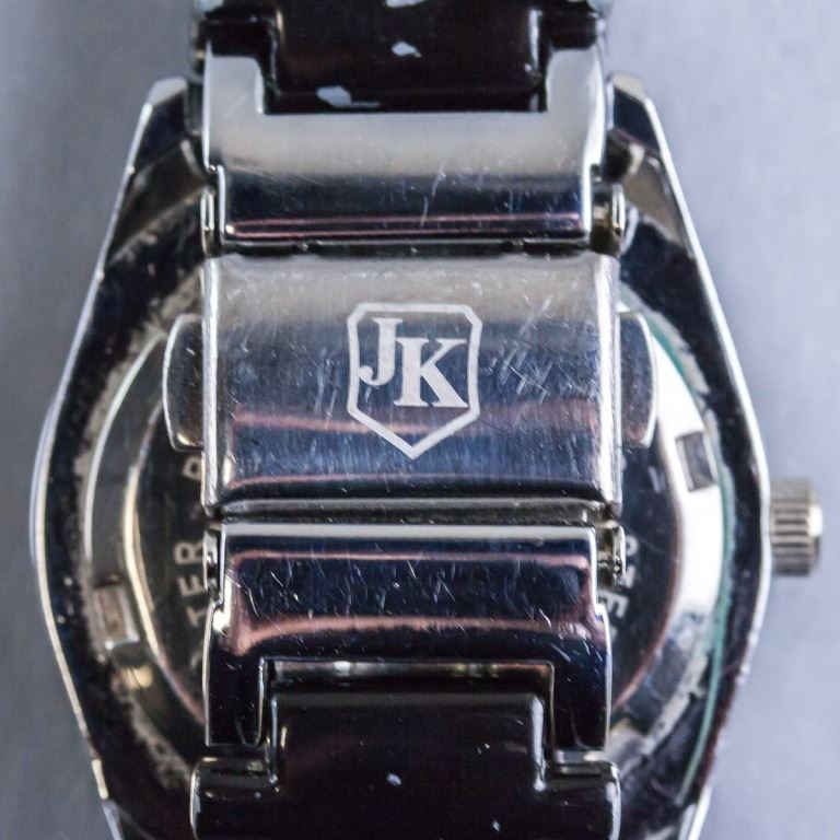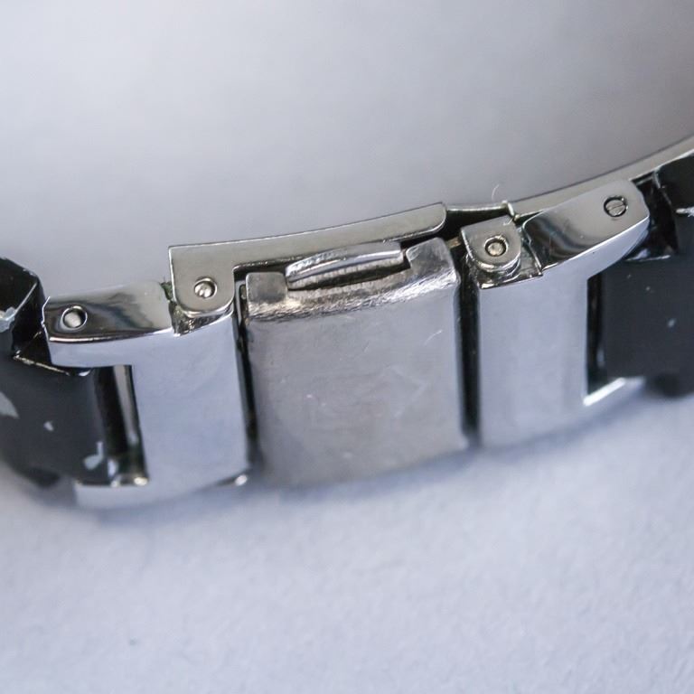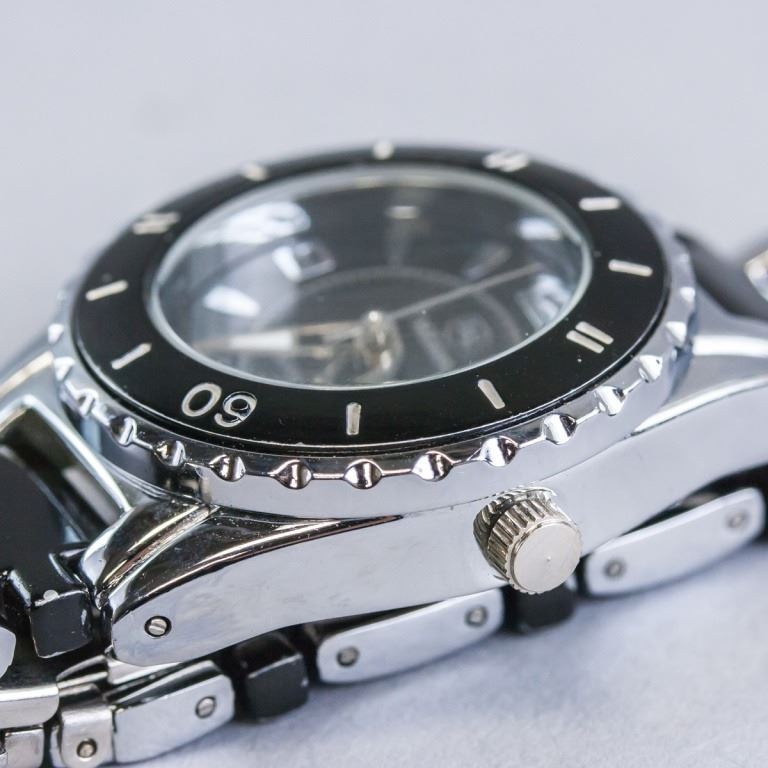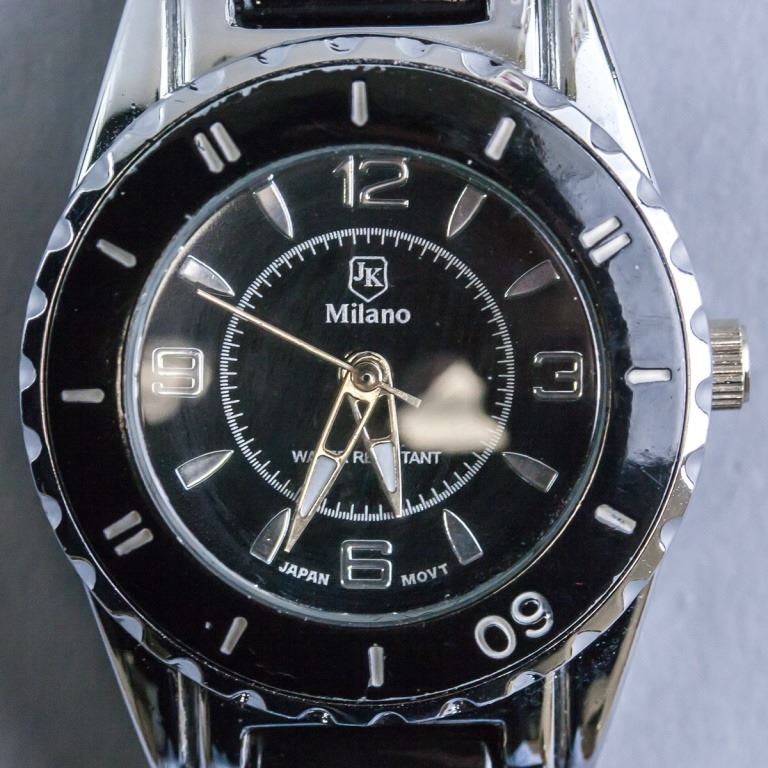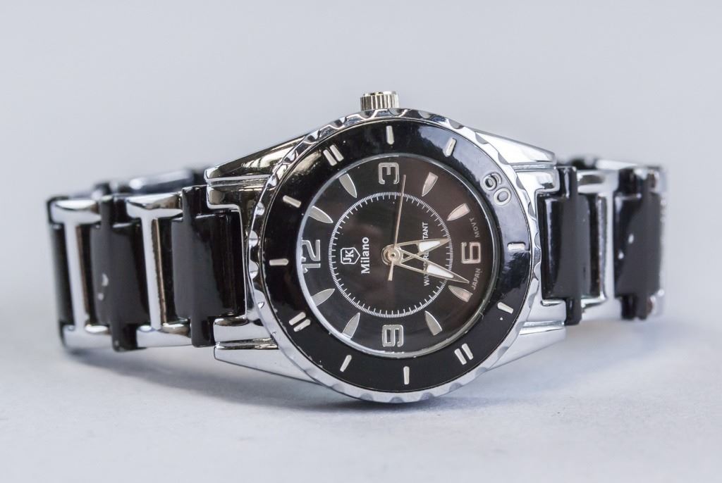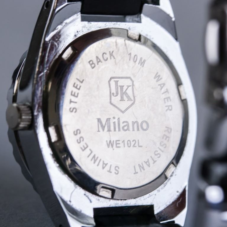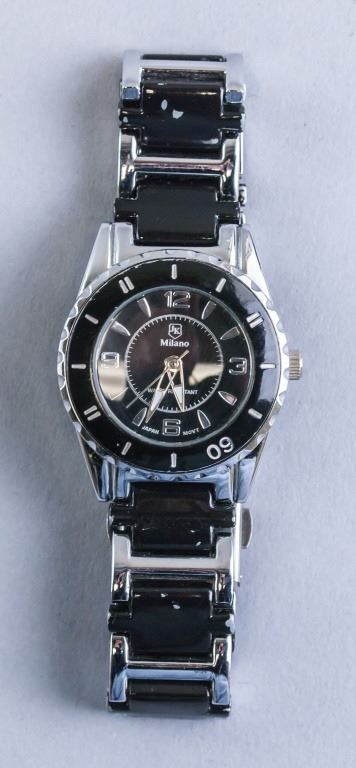 Men's watch. "Milano / WATER RESISTANT / JAPAN MVT" on watch face. Of black and white tone. "STAINLESS STEEL" on watch band. "STAINLESS STEEL BACK / 10M WATER RESISTANT / Milano / WE102L" on back of watch. Overall length: 12 cm. Face: 3 cm.