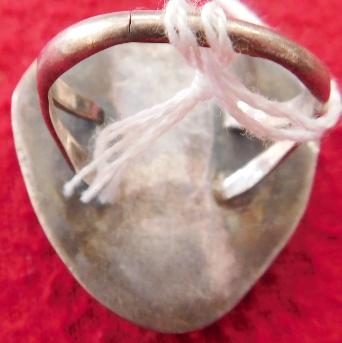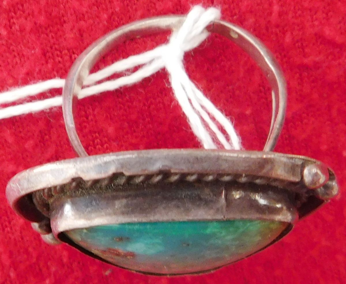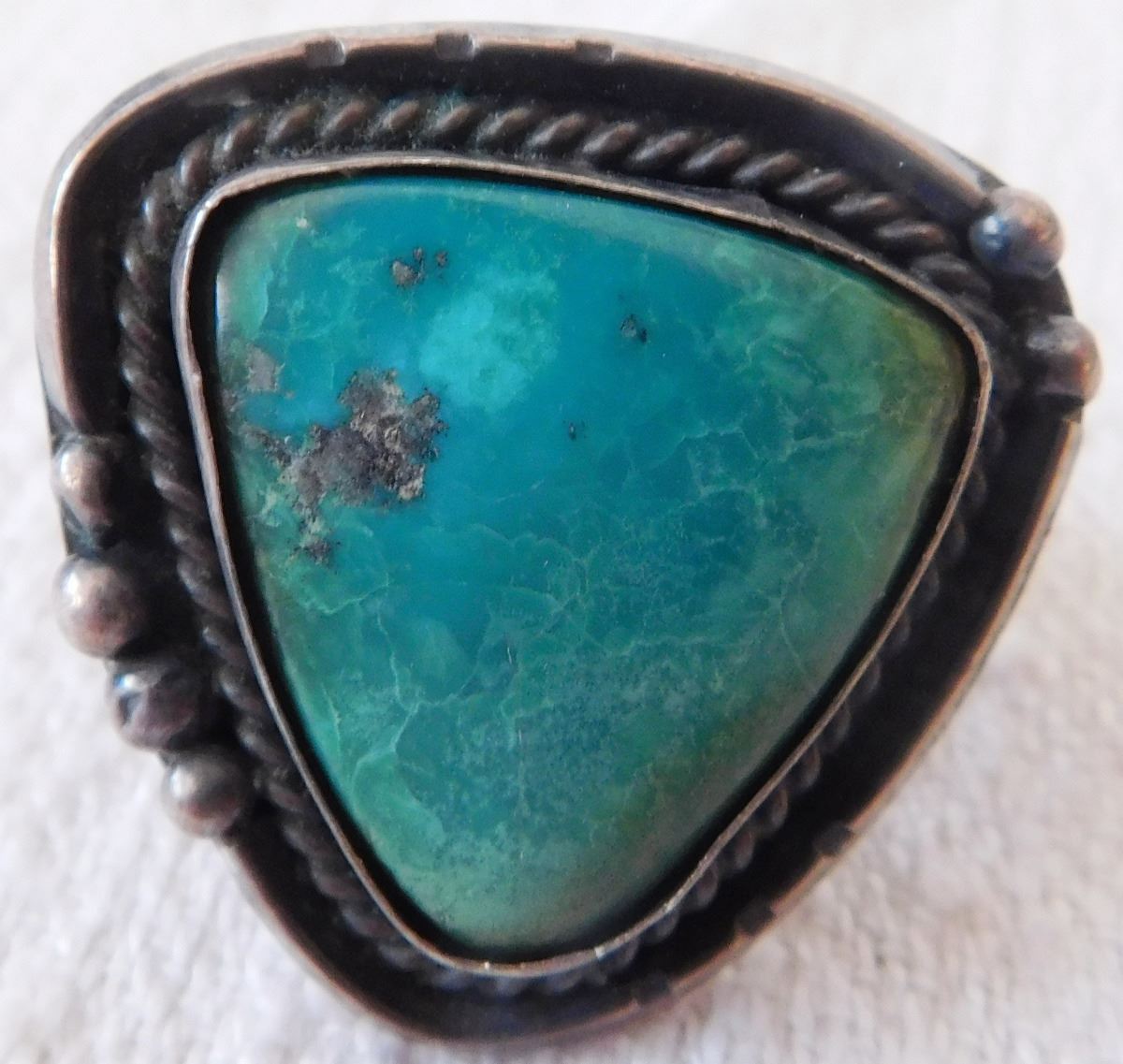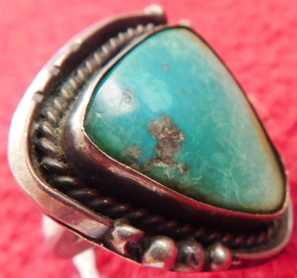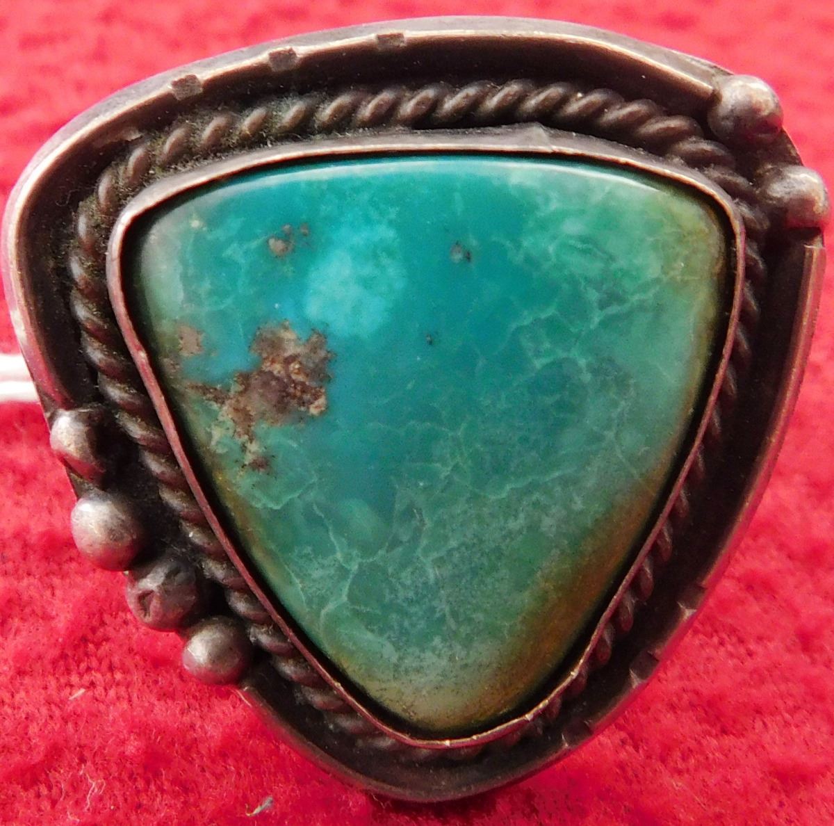 Men's Navajo Ring, circa 1940s. Made of sterling silver and turquoise, this item measures 1.25" x 1.25" x 1.25" with a ring size of 10.5. Lot weight is approx. 11.2 grams. Navajo, from New Mexico. Condition: Some patina, minor scuffs and scrapes, see images. Shipping: $15.50 w/insurance and signature.
