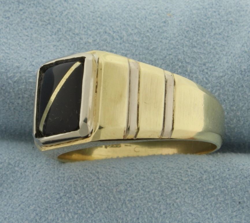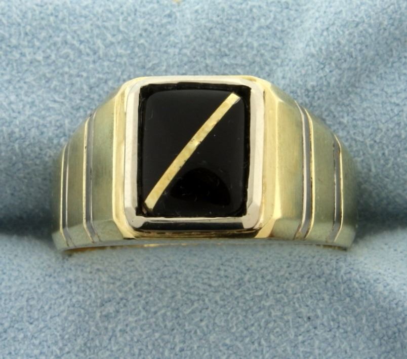 In 14k yellow gold, containing a 10x8mm onyx gemstone. Size 12 3/4. 12.8g.