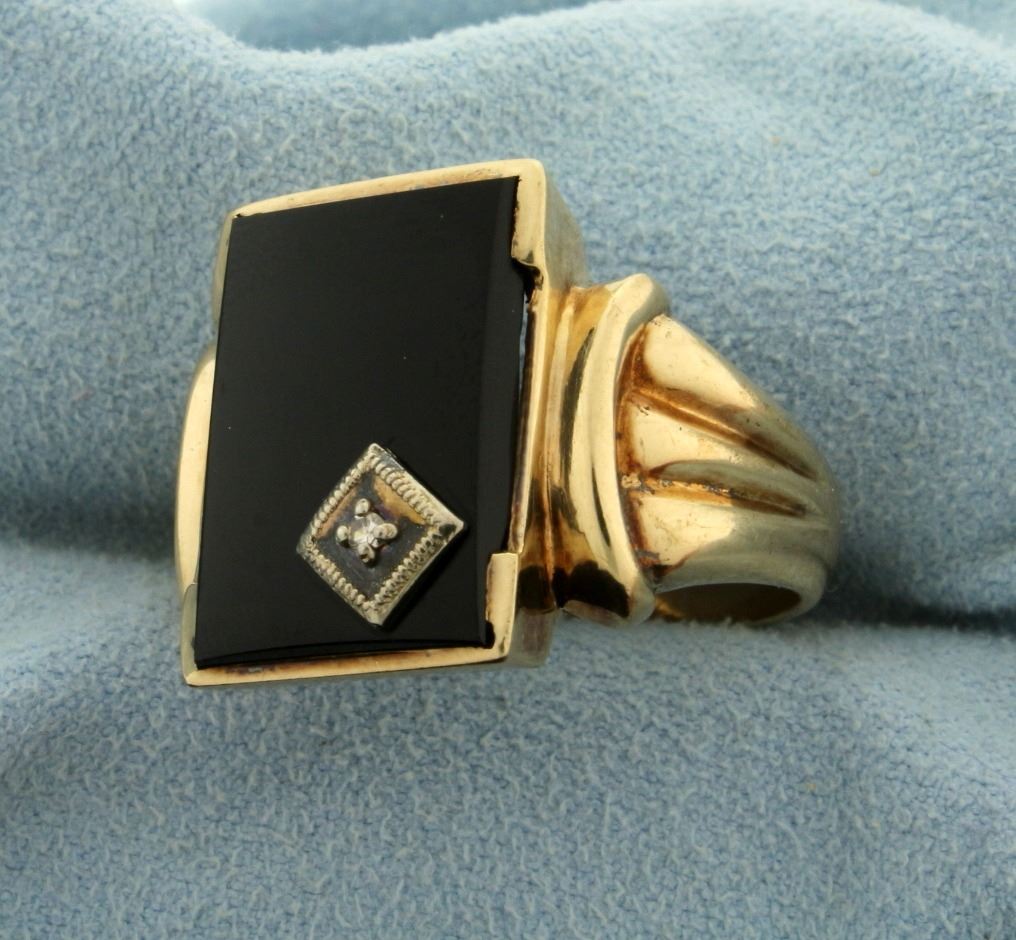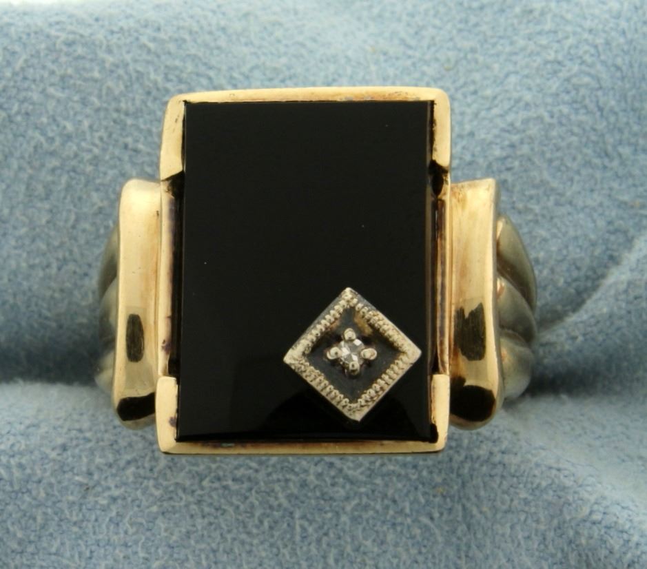 In 14k yellow gold, containing an Onyx that is 17 by 13mm. Also containing a 0.01ct Diamond. Size 11. 8.8g.