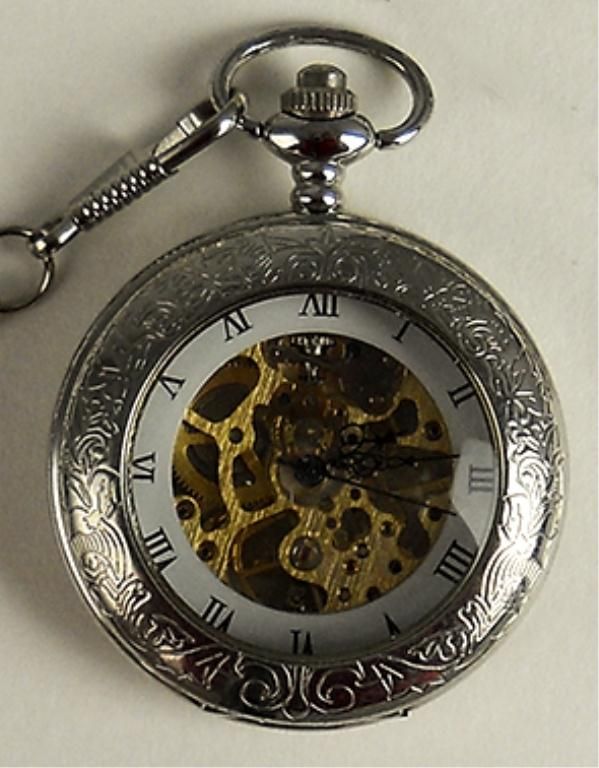 Carved Stainless Steel Men's Pocket Watch With Open Back And Front So That The Works Can Be Viewed From The Back And Front. The Time Is Displayed On A White Background With Roman Numerals. The Watch Has A Mechanical Movement. A Stainless Steel Matching Chain Accompanies The Watch.