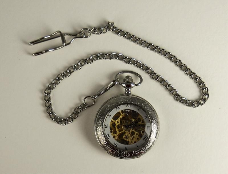 Carved Stainless Steel Men's Pocket Watch With Open Back And Front So That The Works Can Be Viewed From The Back And Front. The Time Is Displayed On A White Background With Roman Numerals. The Watch Has A Mechanical Movement. A Stainless Steel Matching Chain Accompanies The Watch.