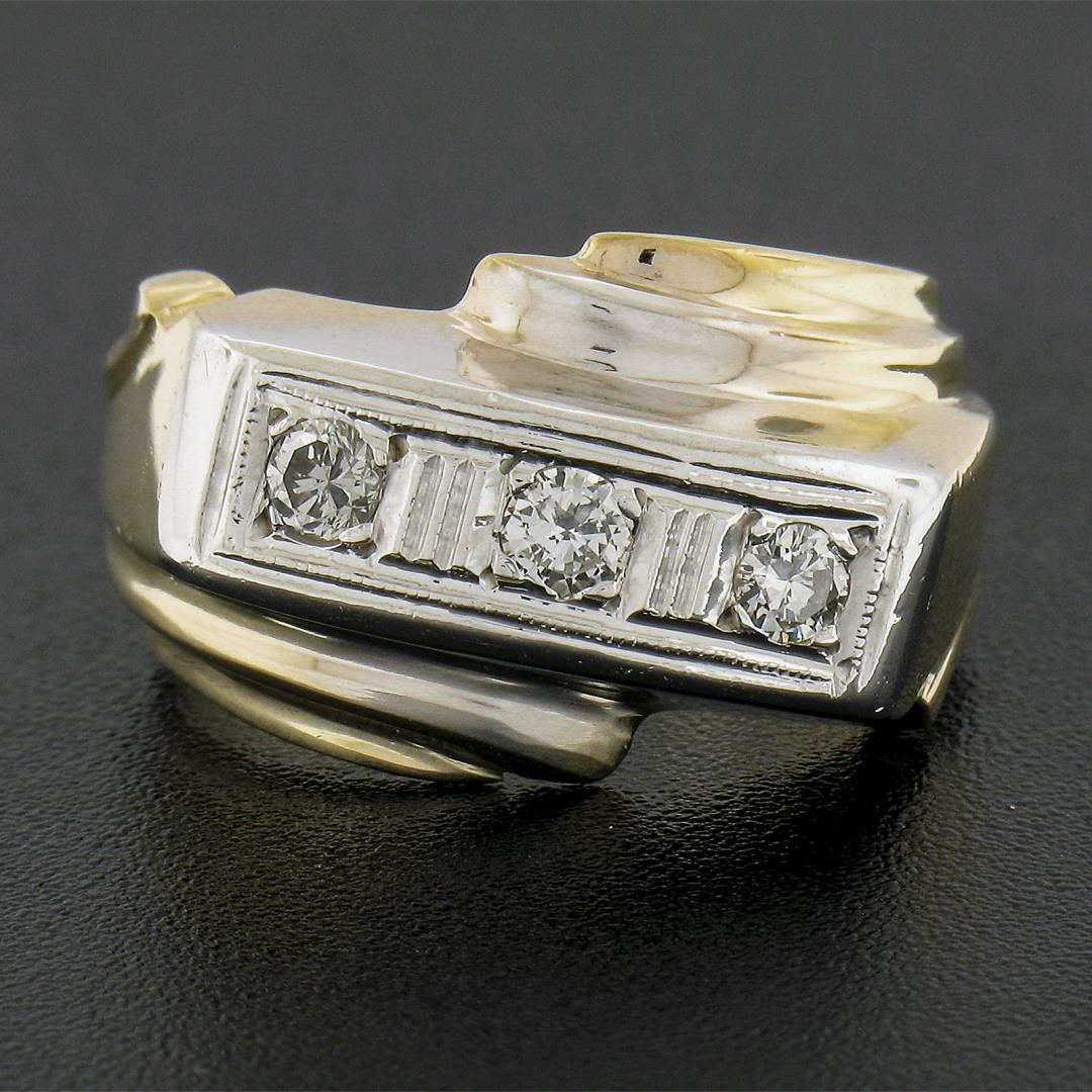 A vintage solid 14k yellow & white gold men's bypass band ring, with 3 round & old transitional cut natural diamonds ( J-L - SI1-I1 ; 0.25ctw). The ring is size 7.0, weighs a total of 6.63 grams, and measures 12.9mm wide.