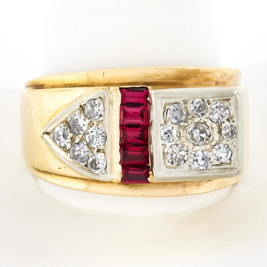 A vintage solid 14k yellow and white gold band ring, with 15 old single cut natural diamonds (G-I - VS2-SI2 ; 0.40ctw), and 5 baguette cut synthetic rubies. The ring is size 12.0, weighs a total of 9.04 grams, and measures 13.55mm wide.