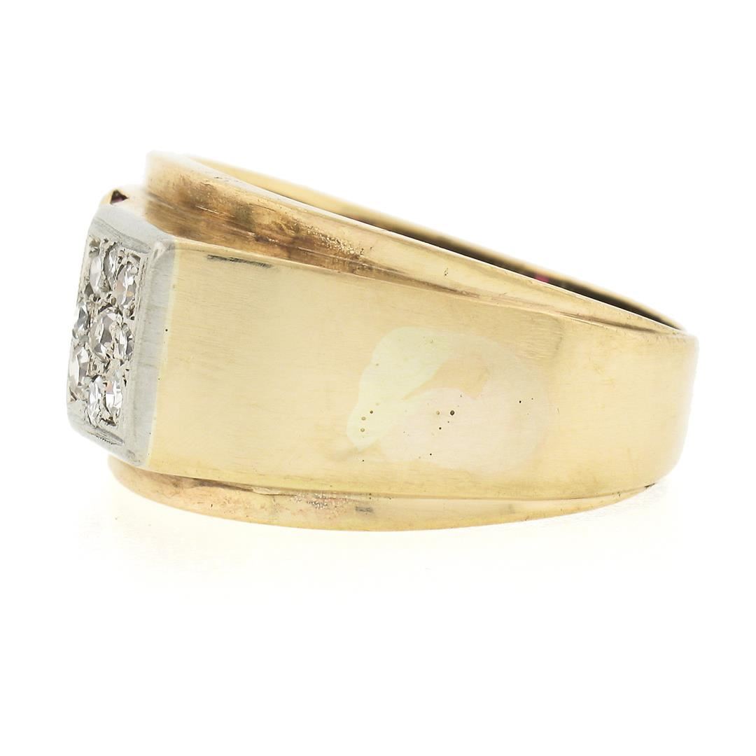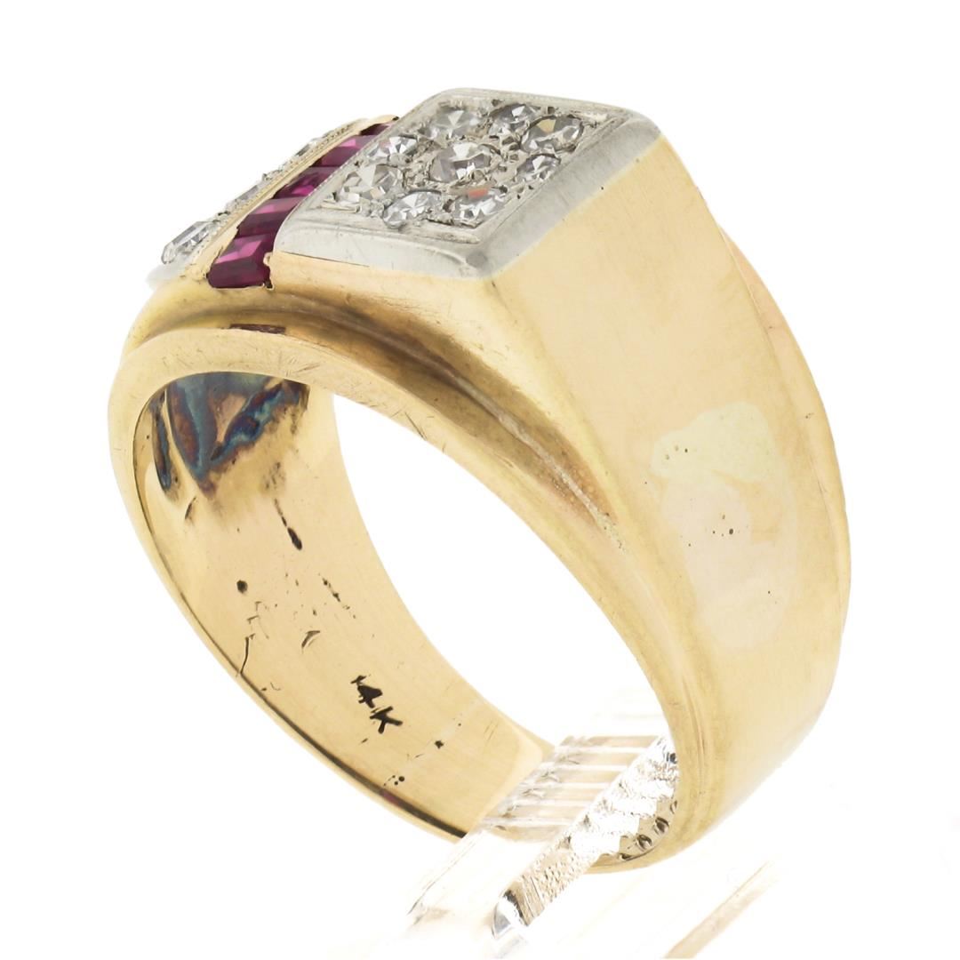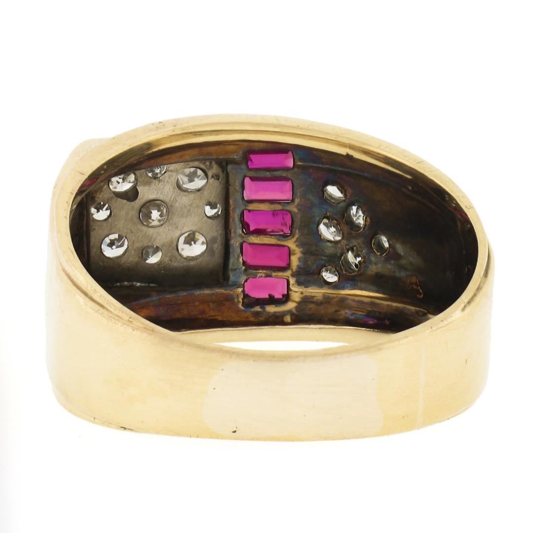 A vintage solid 14k yellow and white gold band ring, with 15 old single cut natural diamonds (G-I - VS2-SI2 ; 0.40ctw), and 5 baguette cut synthetic rubies. The ring is size 12.0, weighs a total of 9.04 grams, and measures 13.55mm wide.
