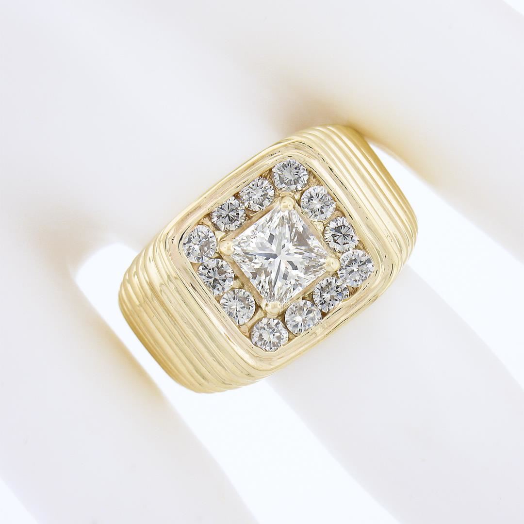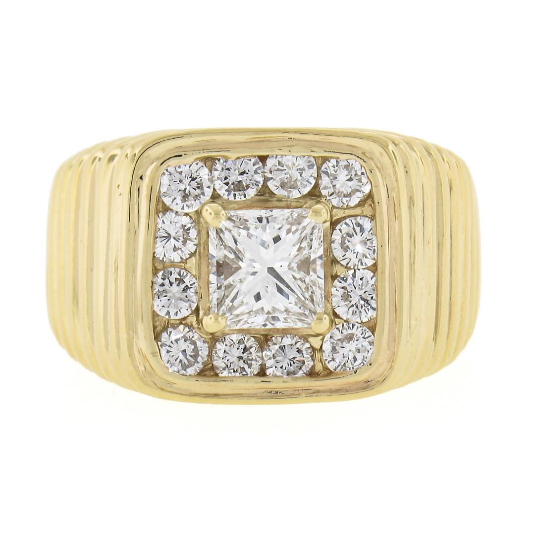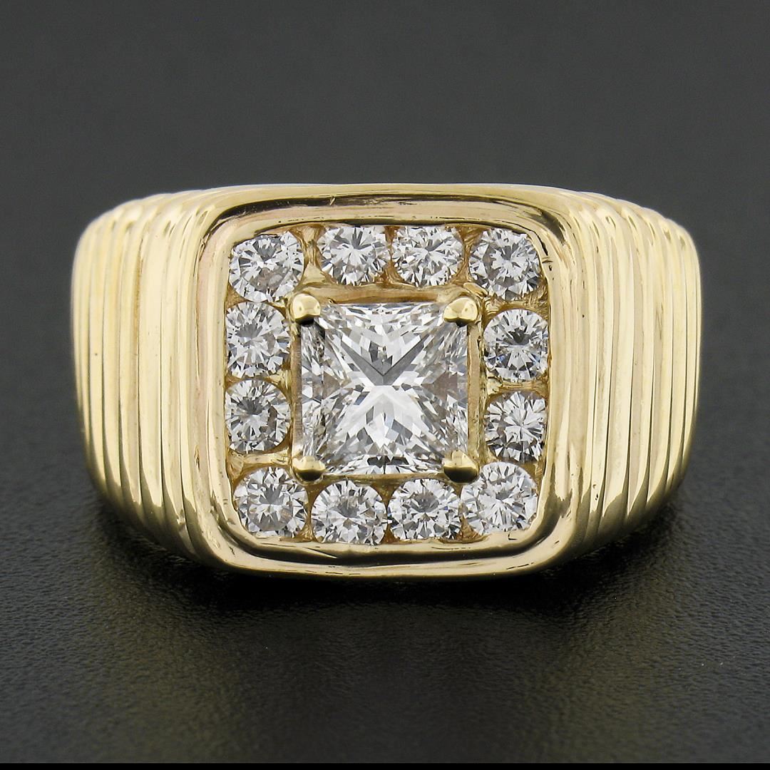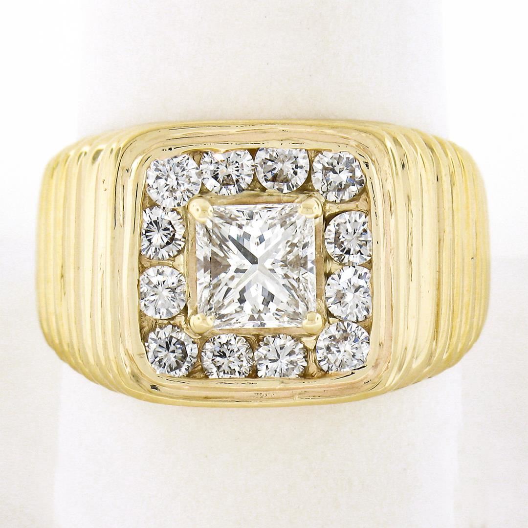 A solid 14k yellow gold ribbed ring, with 1 GIA graded princess cut natural diamond ( G - VS2 ; 1.07ct), surrounded with a halo of 12 round cut natural diamonds (G/H - VS2/SI1 ; 0.84ctw). The ring is size 10.0, weighs a total of 14.40 grams, and measures 13.7mm wide. Comes with all original relevant certifications.