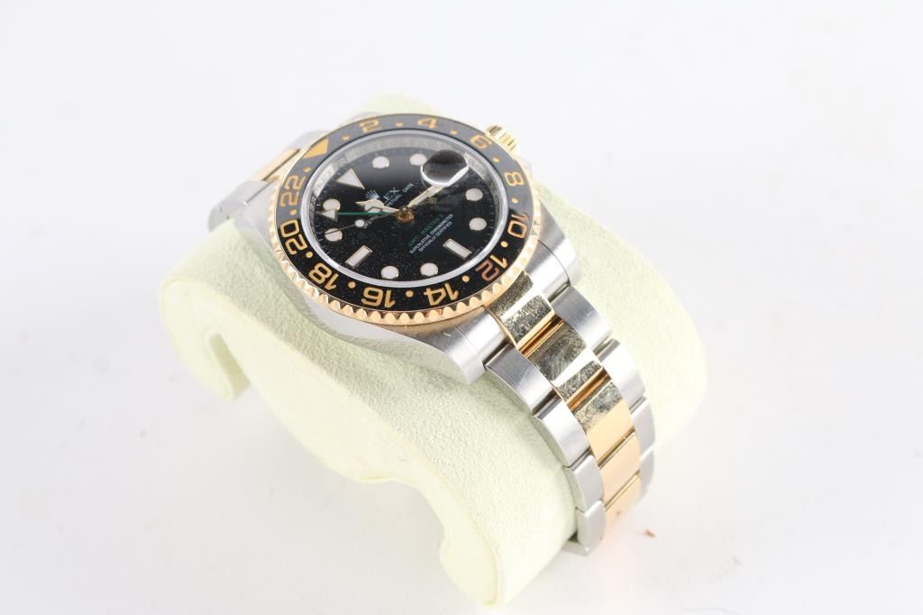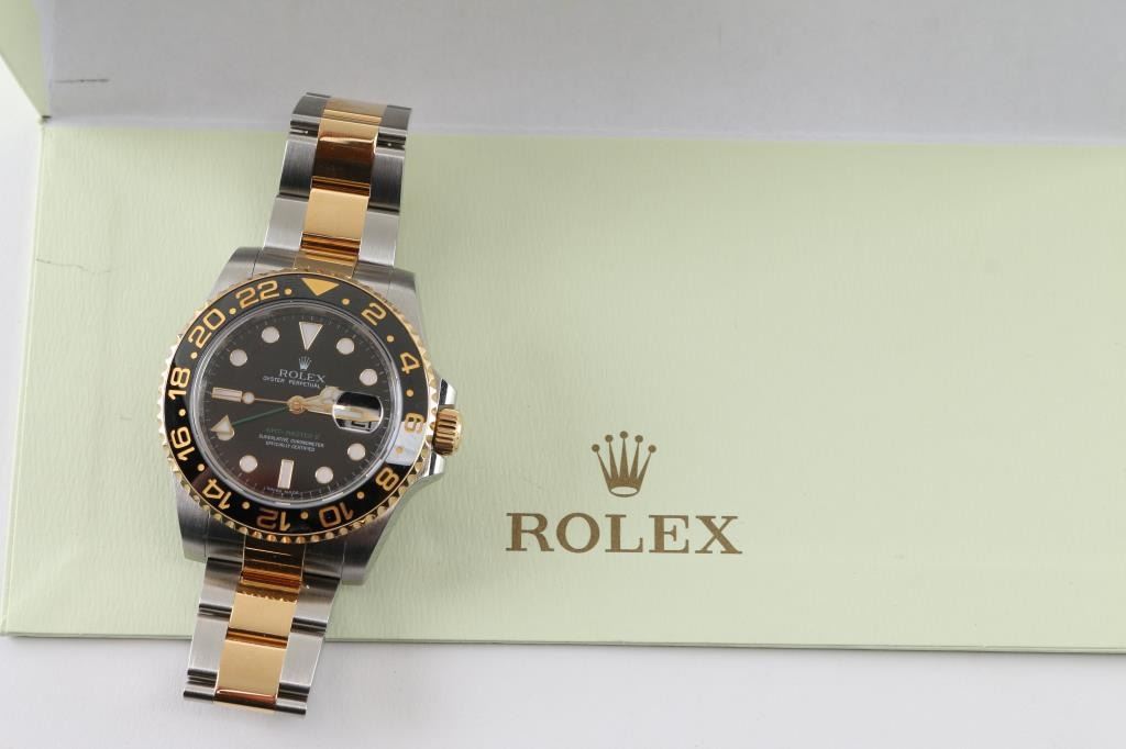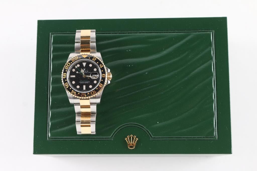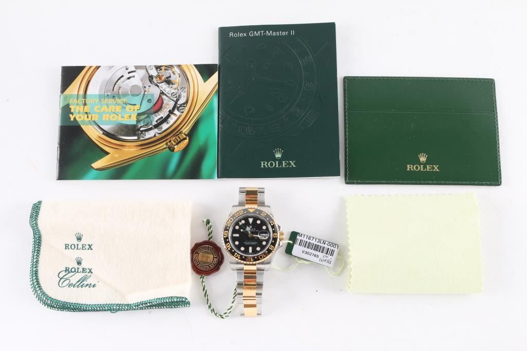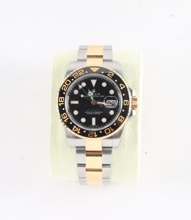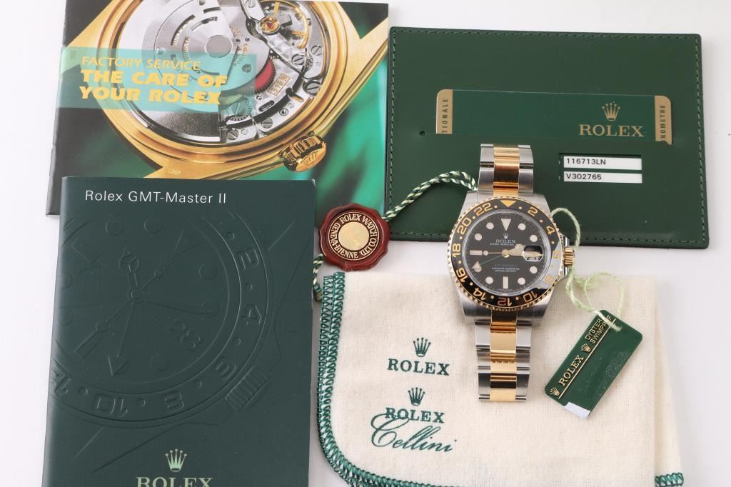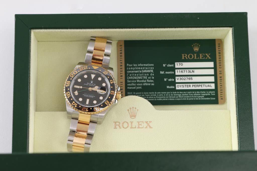 wristwatch, Black two-tone, 18K gold and stainless steel. RED116713LN Serial number V302765 Oyster Perpetual. Pre-owned Rolex GMT Master II, will never go out of style. Rolex's iconic pilot's watch first hit the market in the 1950s and continues to mesmerize horology buffs with its enduring and iconic aesthetic. Reference is a contemporary steel and gold Rolex, introduced in the late 2000s. It replaced the 5-digit series and brought a newer-style "Super" case, bracelet, movement, and Maxi dial. The bezel is now topped with a ceramic - aka Cerachrom - insert. This watch is undeniably modern and will appeal to nearly every collector. We also love the Rolex because it was recently discontinued to make way for the current generation of GMTs. It's a highly prized collector's item that we expect will only become more coveted long-term. Comes with original Rolex case, box, and Rolex card , hang tag, and manual.