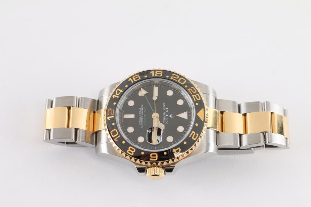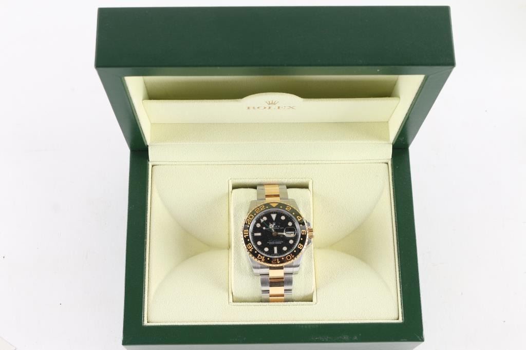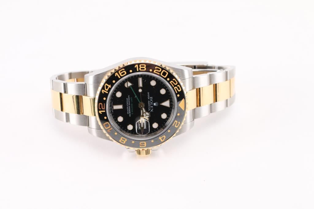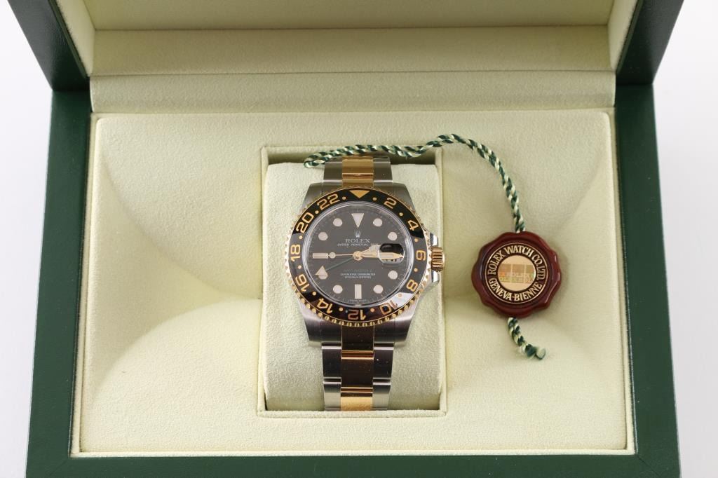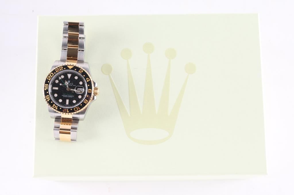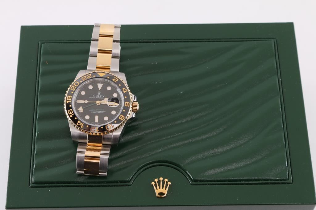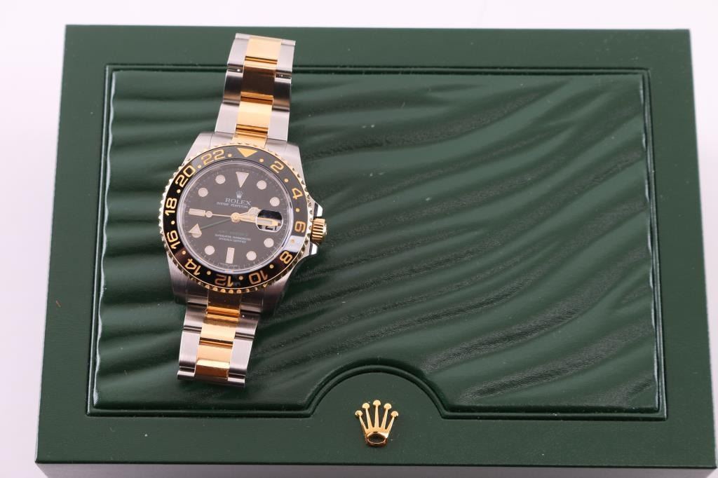 wristwatch, Black two-tone, 18K gold and stainless steel. RED116713LN Serial number V302765 Oyster Perpetual. Pre-owned Rolex GMT Master II, will never go out of style. Rolex's iconic pilot's watch first hit the market in the 1950s and continues to mesmerize horology buffs with its enduring and iconic aesthetic. Reference is a contemporary steel and gold Rolex, introduced in the late 2000s. It replaced the 5-digit series and brought a newer-style "Super" case, bracelet, movement, and Maxi dial. The bezel is now topped with a ceramic - aka Cerachrom - insert. This watch is undeniably modern and will appeal to nearly every collector. We also love the Rolex because it was recently discontinued to make way for the current generation of GMTs. It's a highly prized collector's item that we expect will only become more coveted long-term. Comes with original Rolex case, box, and Rolex card , hang tag, and manual.