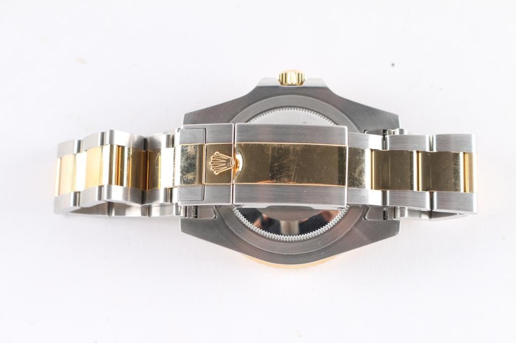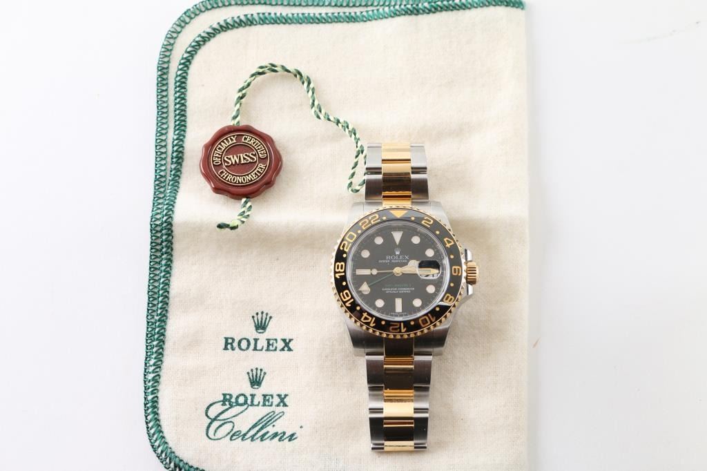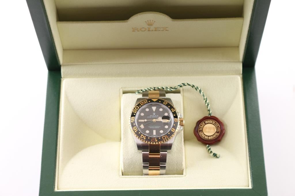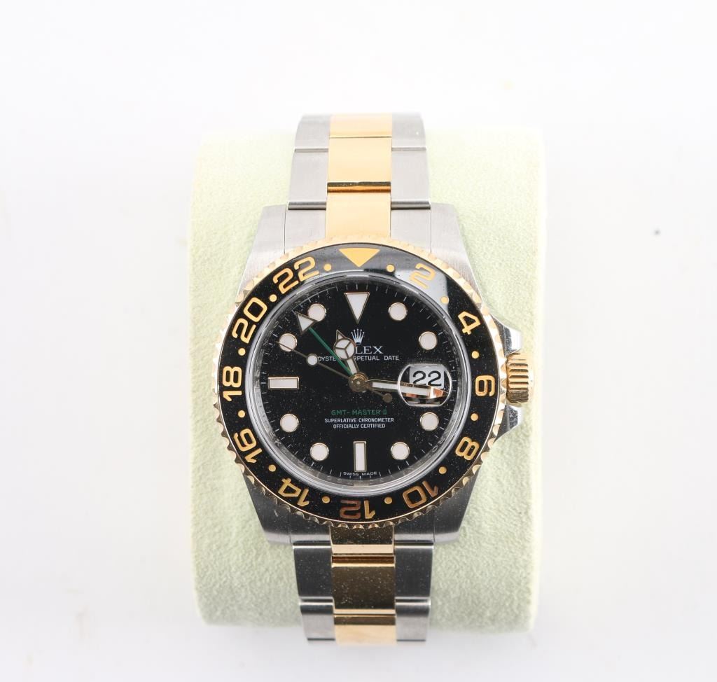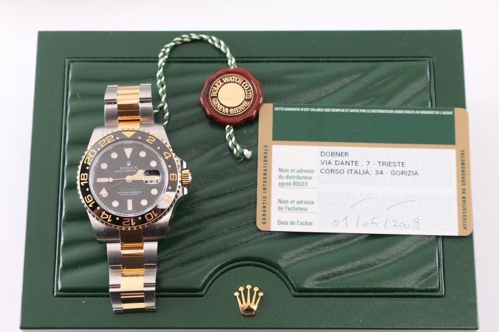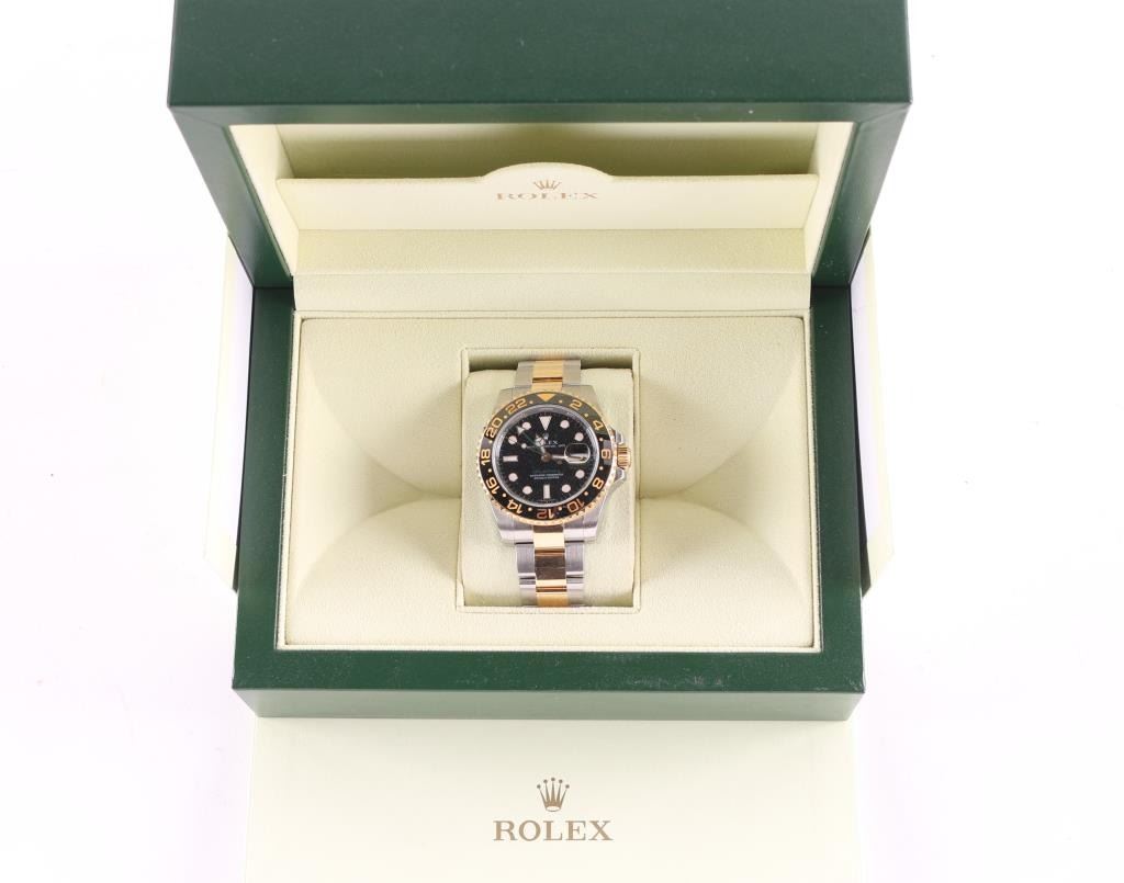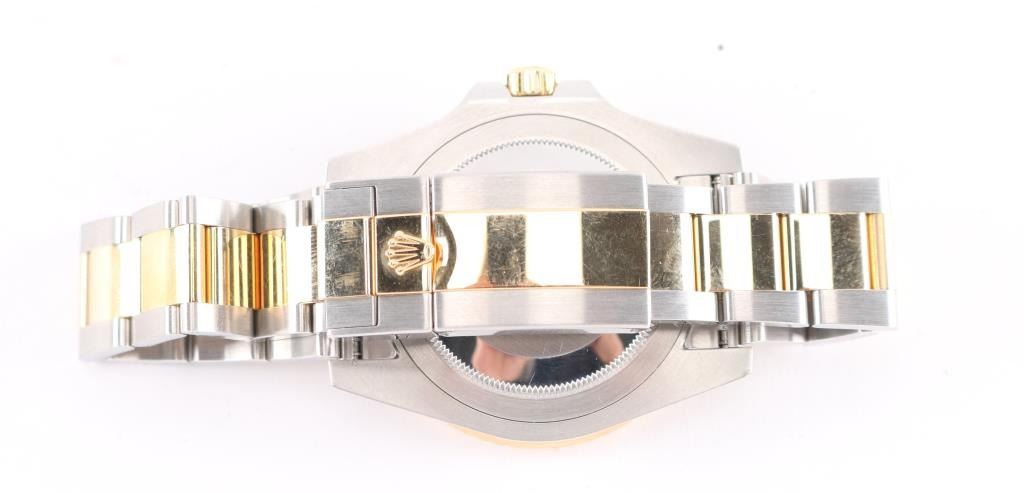 wristwatch, Black two-tone, 18K gold and stainless steel. RED116713LN Serial number V302765 Oyster Perpetual. Pre-owned Rolex GMT Master II, will never go out of style. Rolex's iconic pilot's watch first hit the market in the 1950s and continues to mesmerize horology buffs with its enduring and iconic aesthetic. Reference is a contemporary steel and gold Rolex, introduced in the late 2000s. It replaced the 5-digit series and brought a newer-style "Super" case, bracelet, movement, and Maxi dial. The bezel is now topped with a ceramic - aka Cerachrom - insert. This watch is undeniably modern and will appeal to nearly every collector. We also love the Rolex because it was recently discontinued to make way for the current generation of GMTs. It's a highly prized collector's item that we expect will only become more coveted long-term. Comes with original Rolex case, box, and Rolex card , hang tag, and manual.