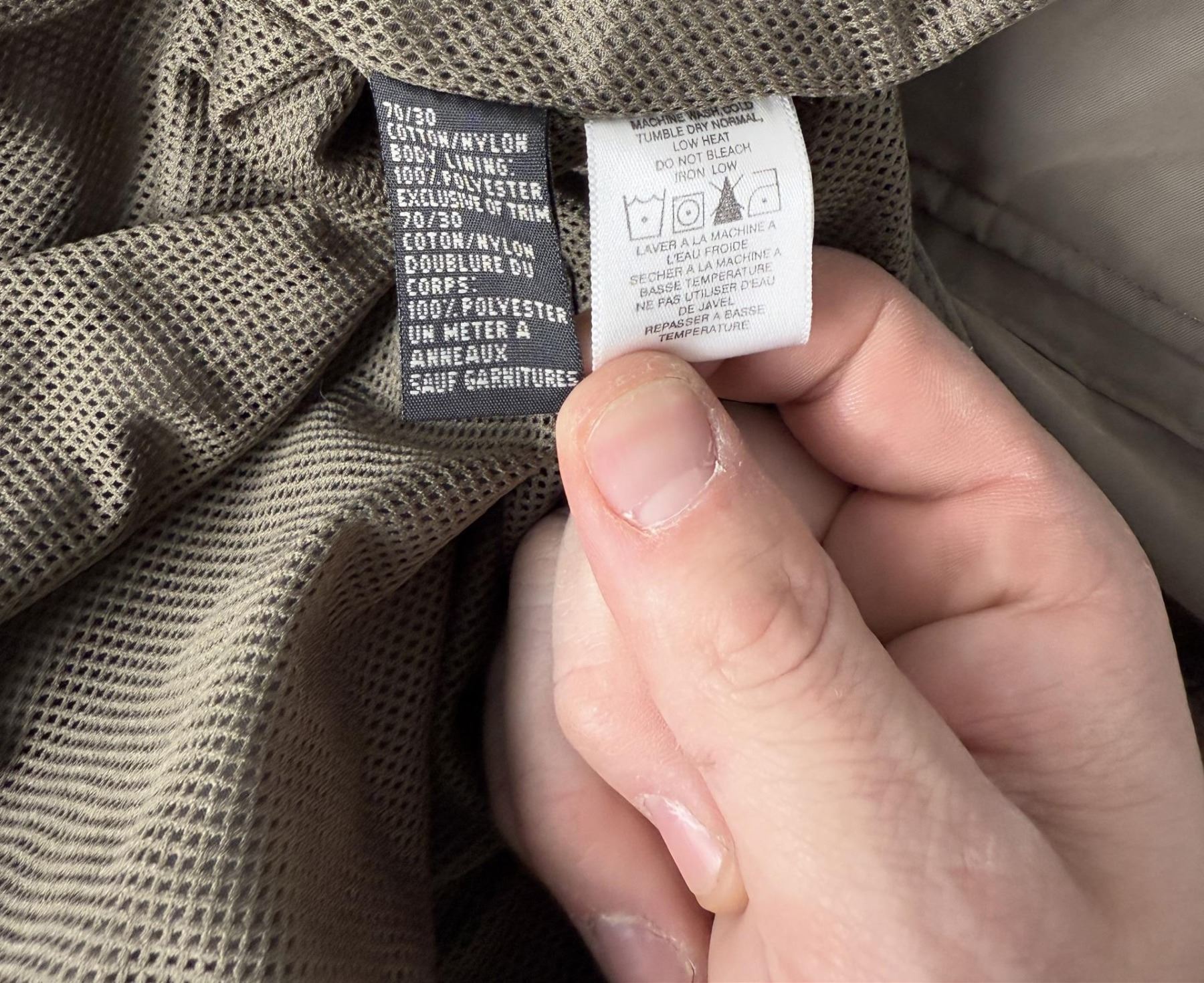 XXL, 70% cotton 30% nylon body, polyester lining.