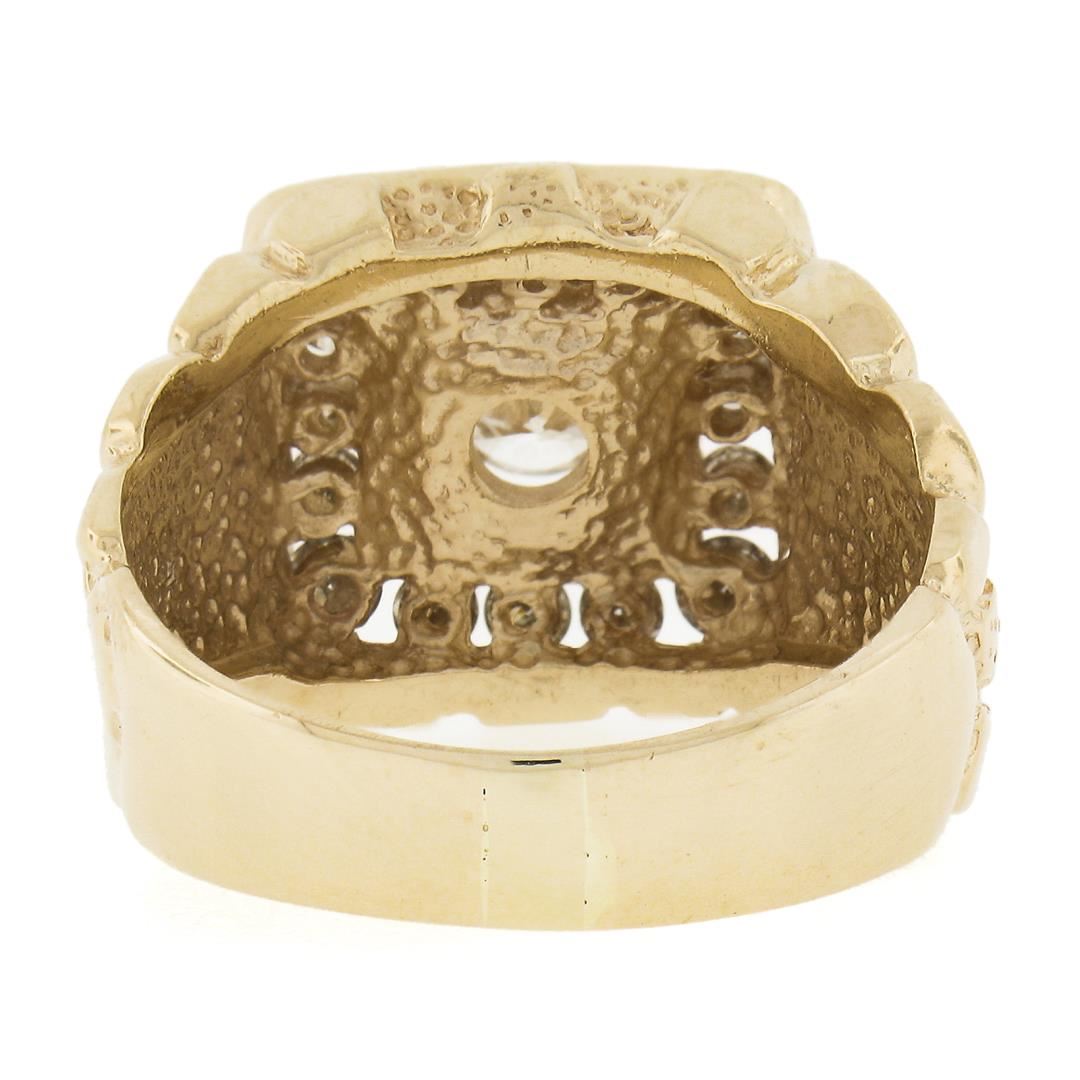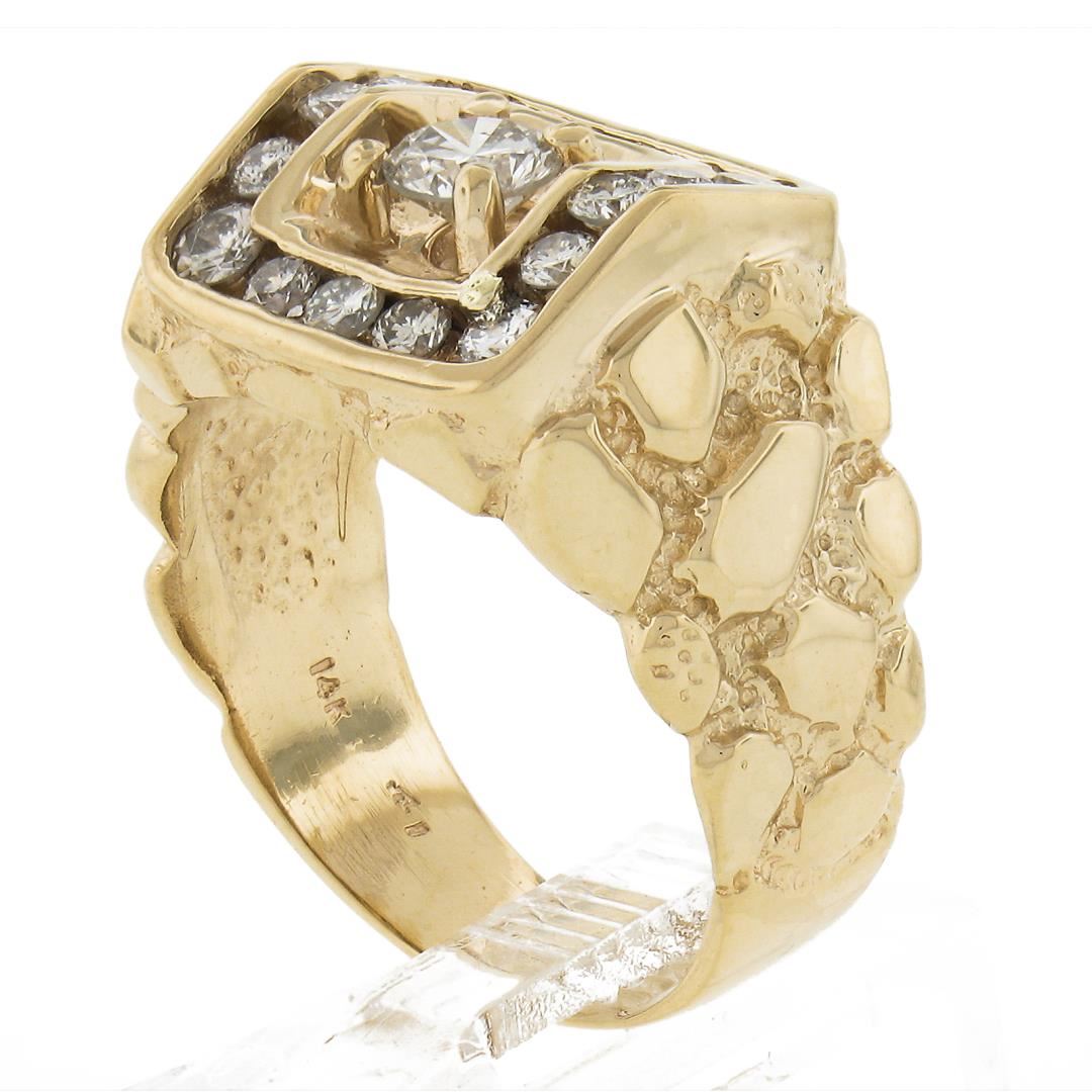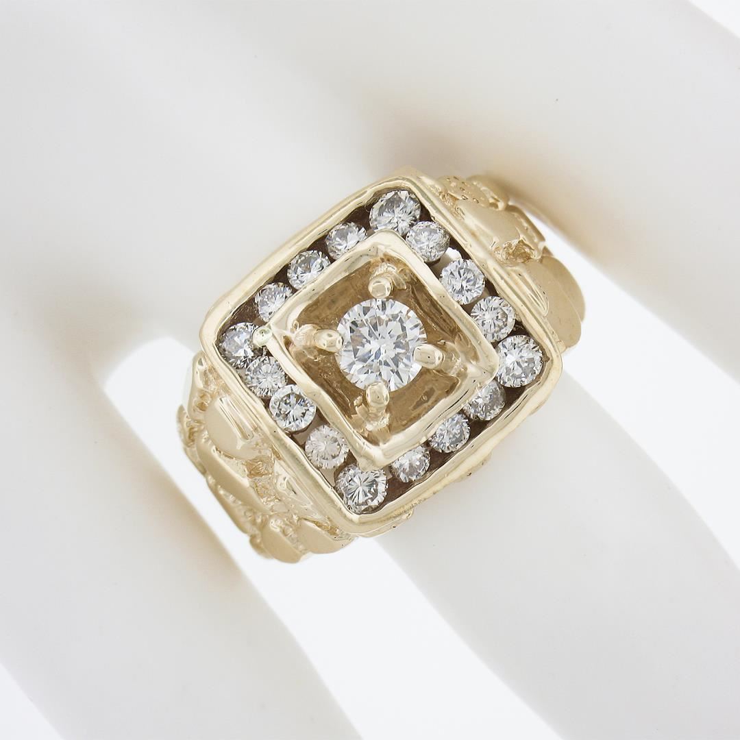 A solid 14k yellow gold nugget style ring, with 1 round cut natural diamond (I - SI1 ; 0.46ct), surrounded with a halo of 16 round cut natural diamonds (H-K - VS2-SI2 ; 0.80ctw). The ring is size 10.5, weighs a total of 12.90 grams, and measures 15.9mm wide.