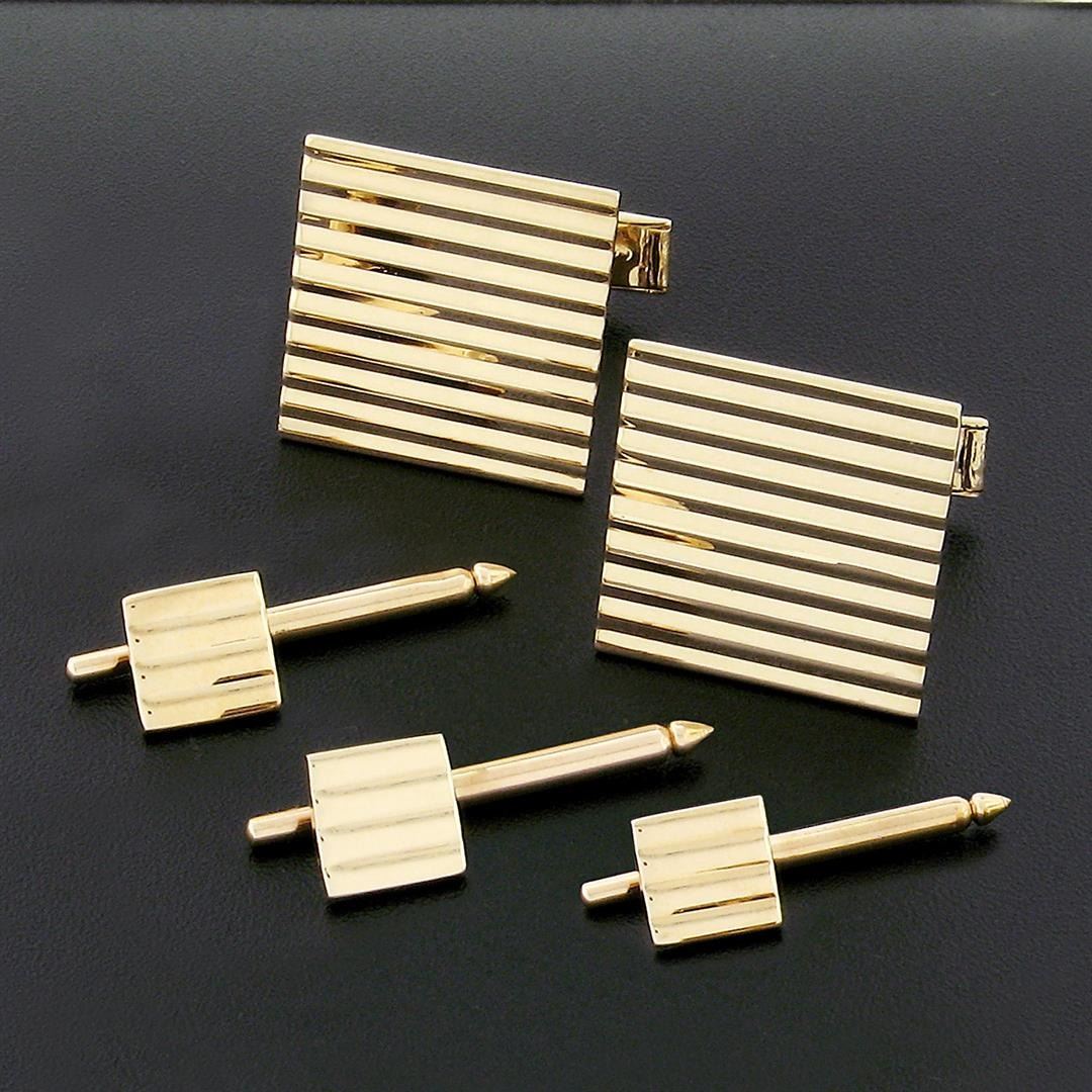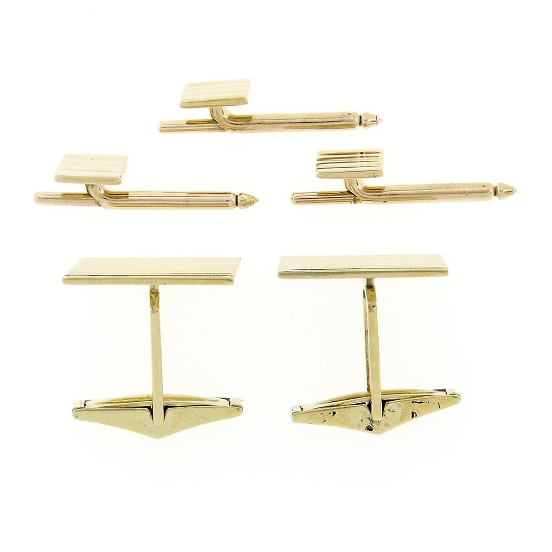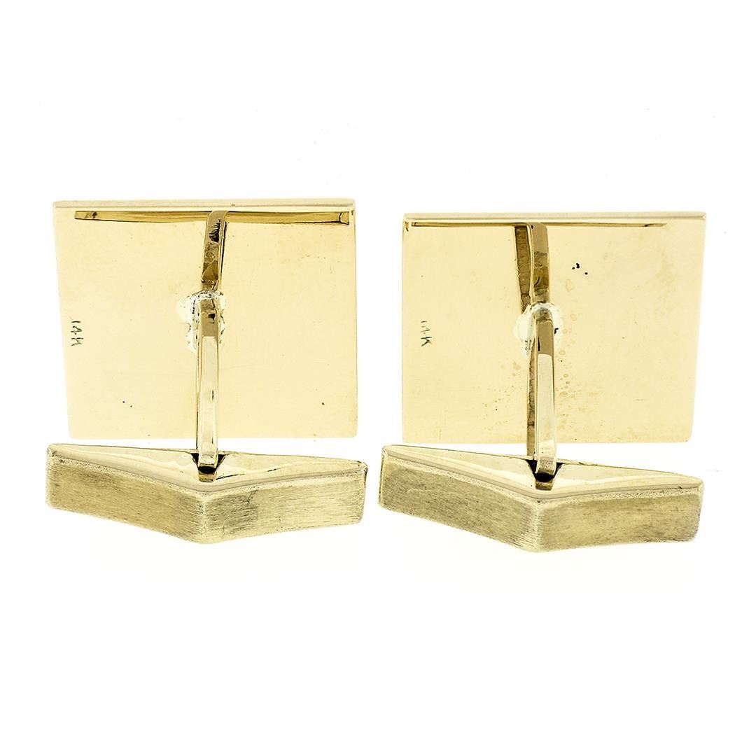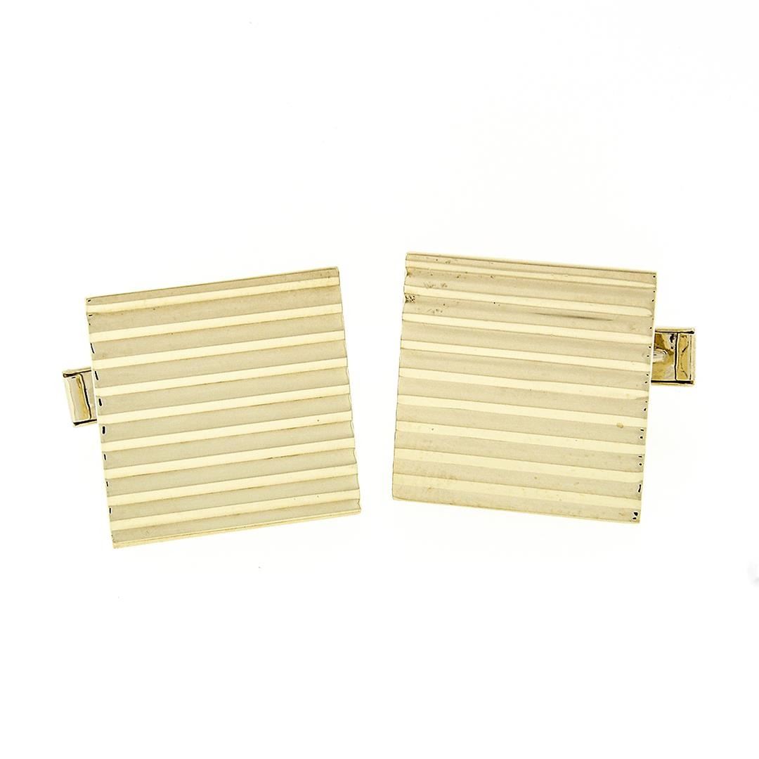 An estate solid 14k yellow gold square cufflinkls. These cuff links have a swivel design with a clearance of 13.92mm, weigh a total of 18.43 grams, and the cuff link panel dimensions 18.9m, and the button stud panel dimensions 7.95mm.