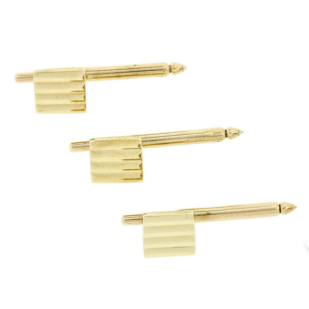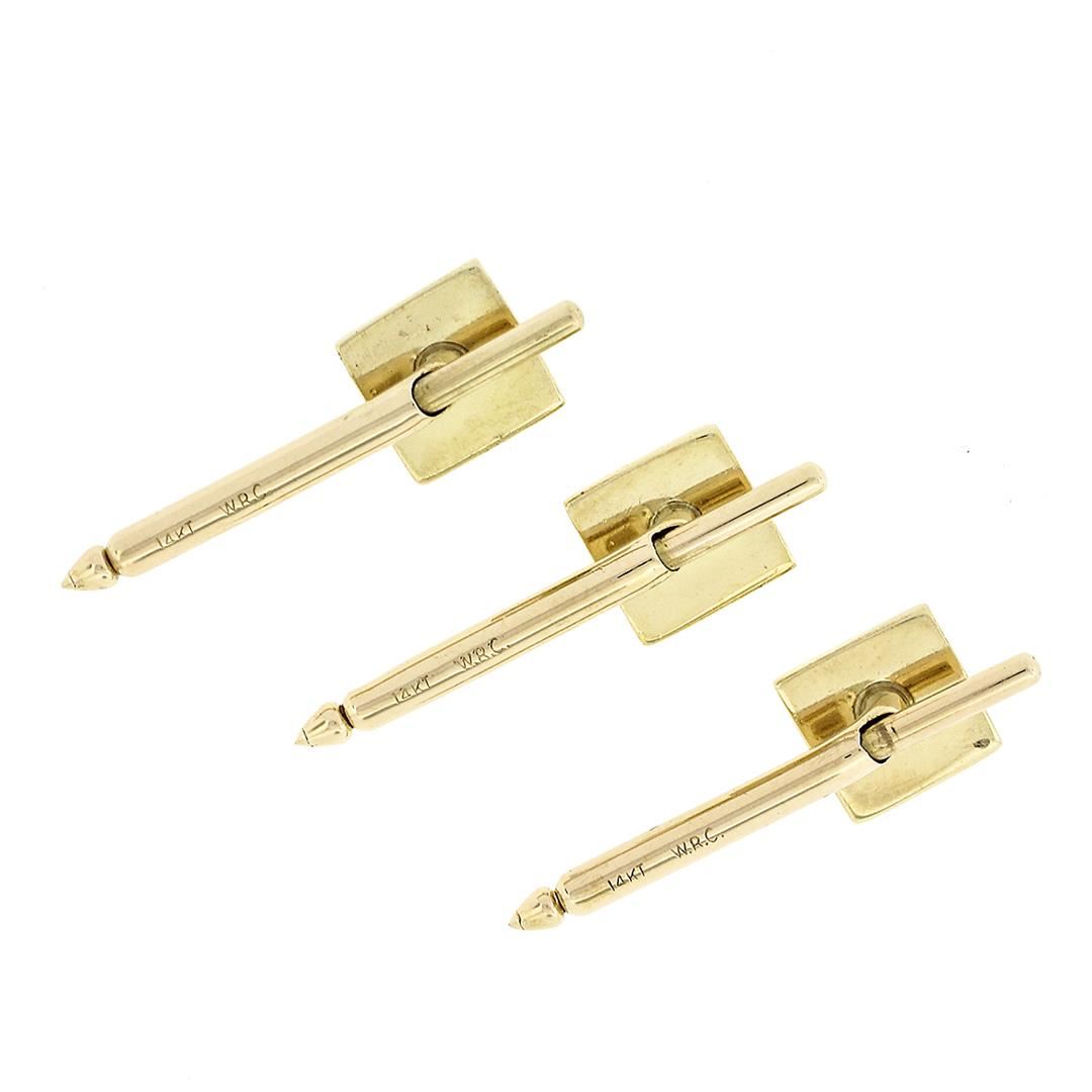 An estate solid 14k yellow gold square cufflinkls. These cuff links have a swivel design with a clearance of 13.92mm, weigh a total of 18.43 grams, and the cuff link panel dimensions 18.9m, and the button stud panel dimensions 7.95mm.