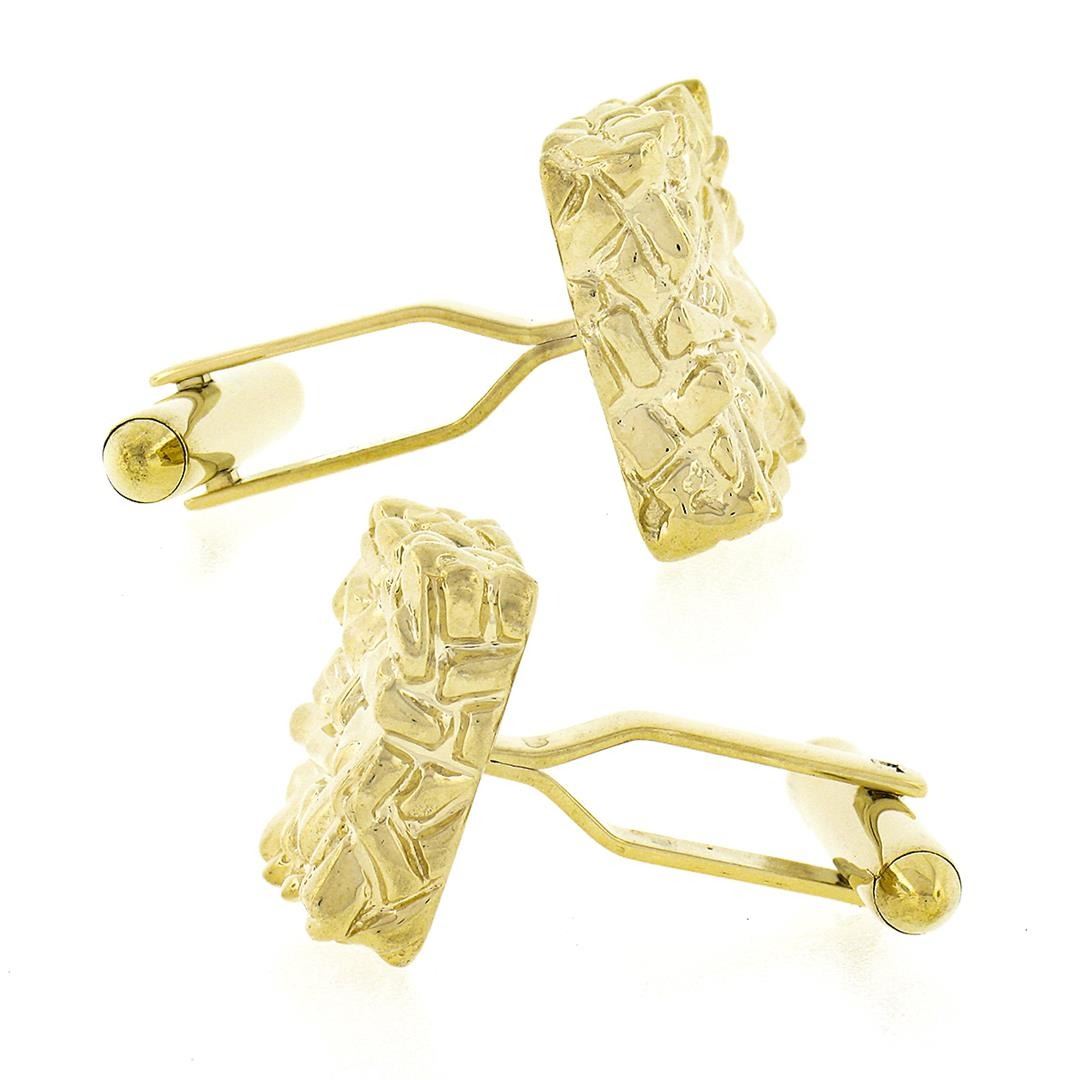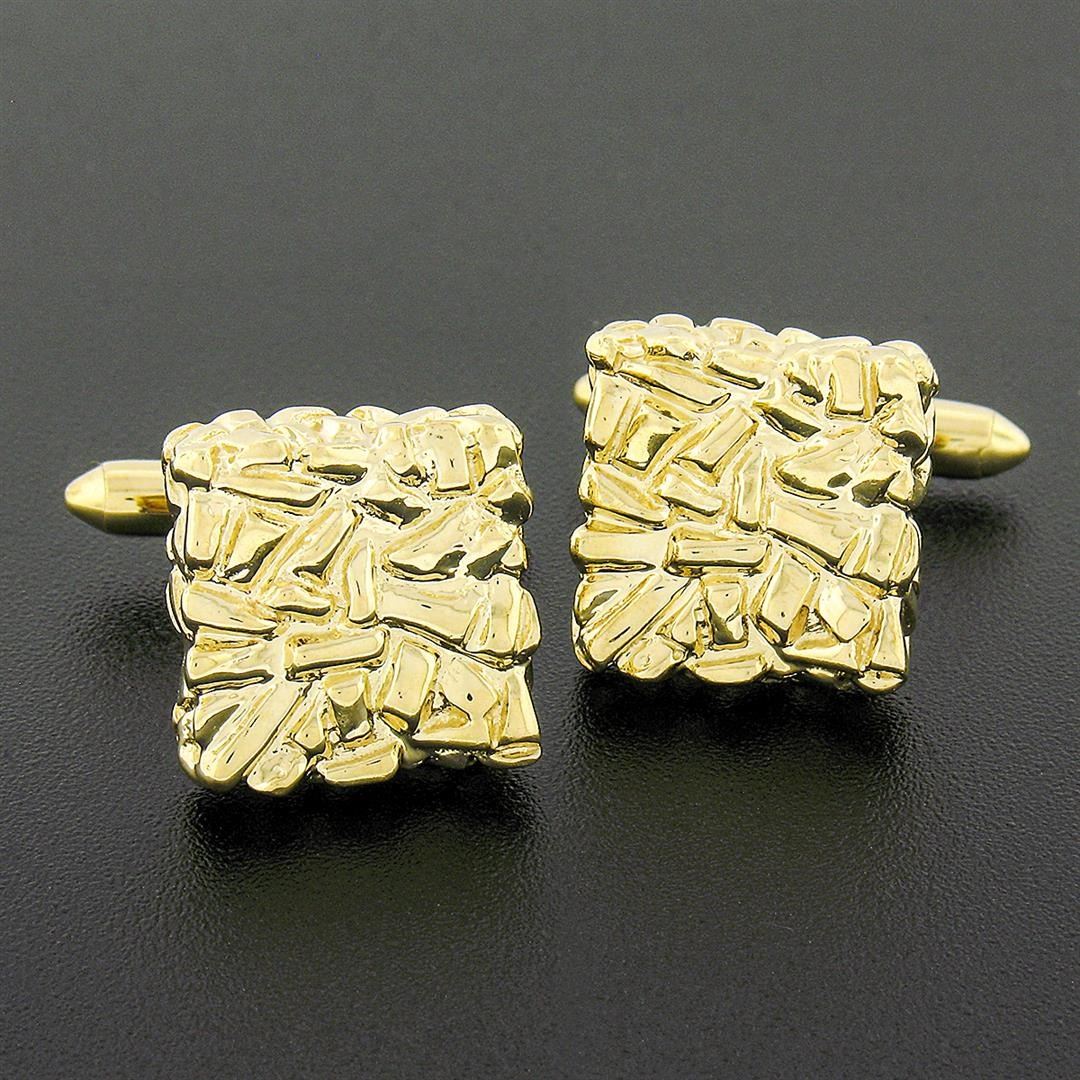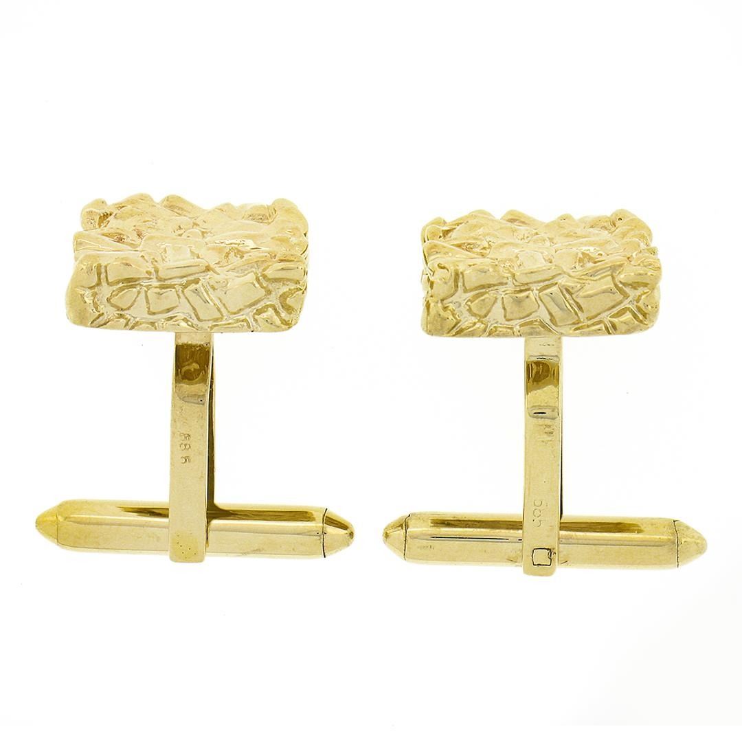 A solid 14k yellow gold cufflinks. These cuff links have a swivel design with a clearance of 14.5mm, weigh a total of 14.14 grams, and the front panels measure 15.70x15.20mm.