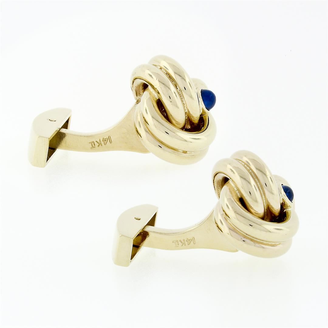 A solid 14k yellow gold cufflinks, with 2 round cabochon cut natural sapphires (3.05mm). These cuff links have a swivel design with a clearance of 11.1mm, weigh a total of 30.62 grams, and the front panels measure 16.0mm.