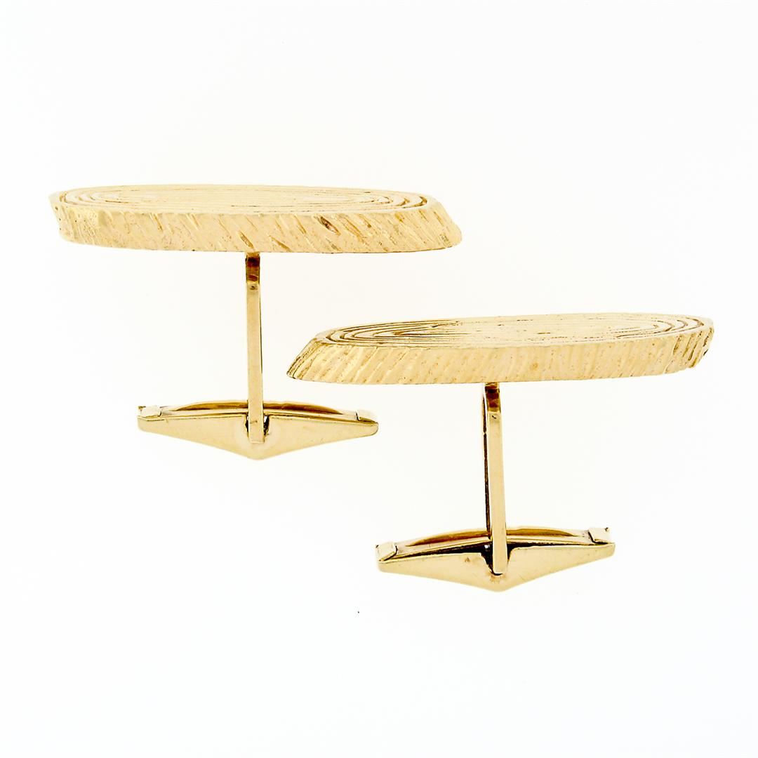 A pair of solid 14k yellow gold oval textured cufflinks. These cuff links have a swivel backs design with a clearance of 12.54mm, weigh a total of 15.41 grams, and the front panels measure 12.27x30.35mm.