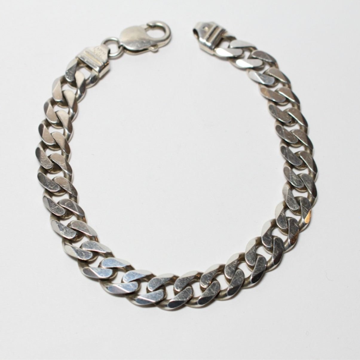Men's Solid Sterling Silver Curb-link bracelet with Lobster Clasp. Measures 8 3/4" in length with a weight of 27.35 grams.
