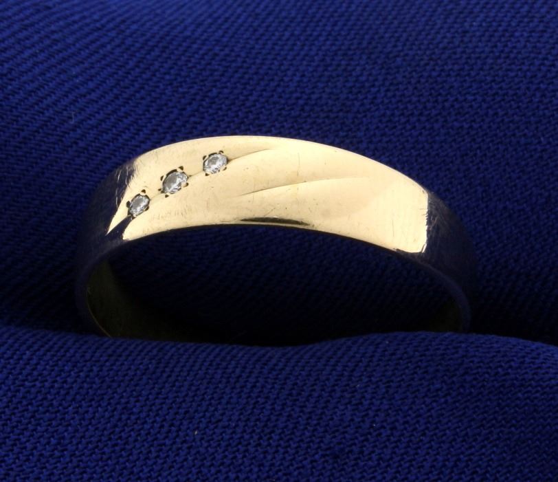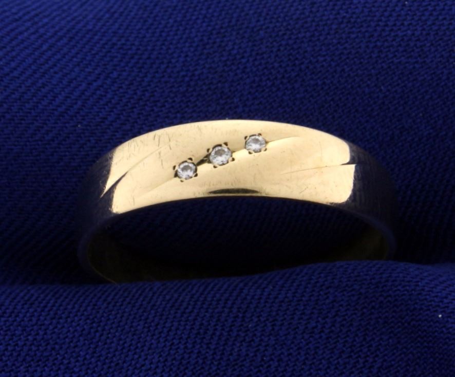 In 14k yellow gold, containing, three 0.01ct Diamonds. Size 12 1/2. 3.4g.