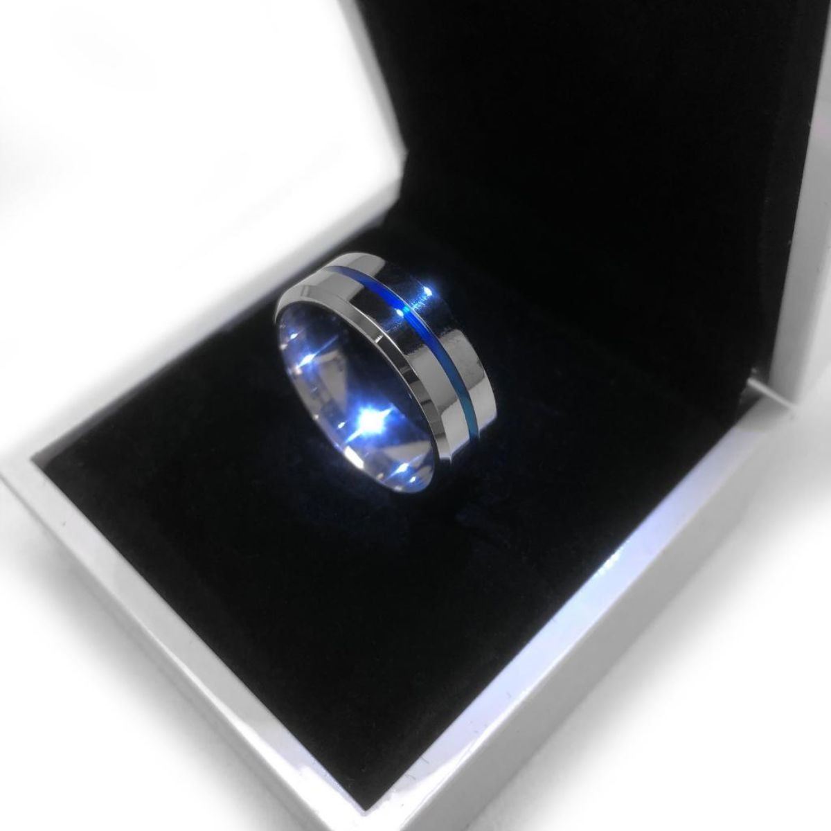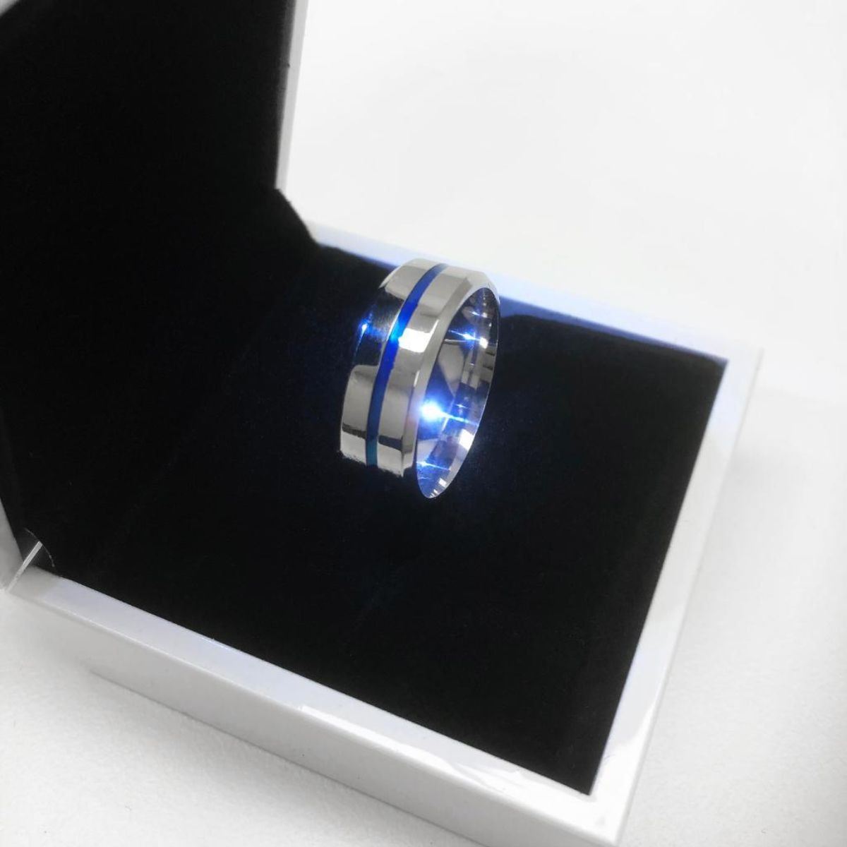 Titanium Steel Silver Brushed, Blue Engagement Ring. Brand New, Size 10. Comes in White Enameled LED Ring Box. See Photos for further inspection.