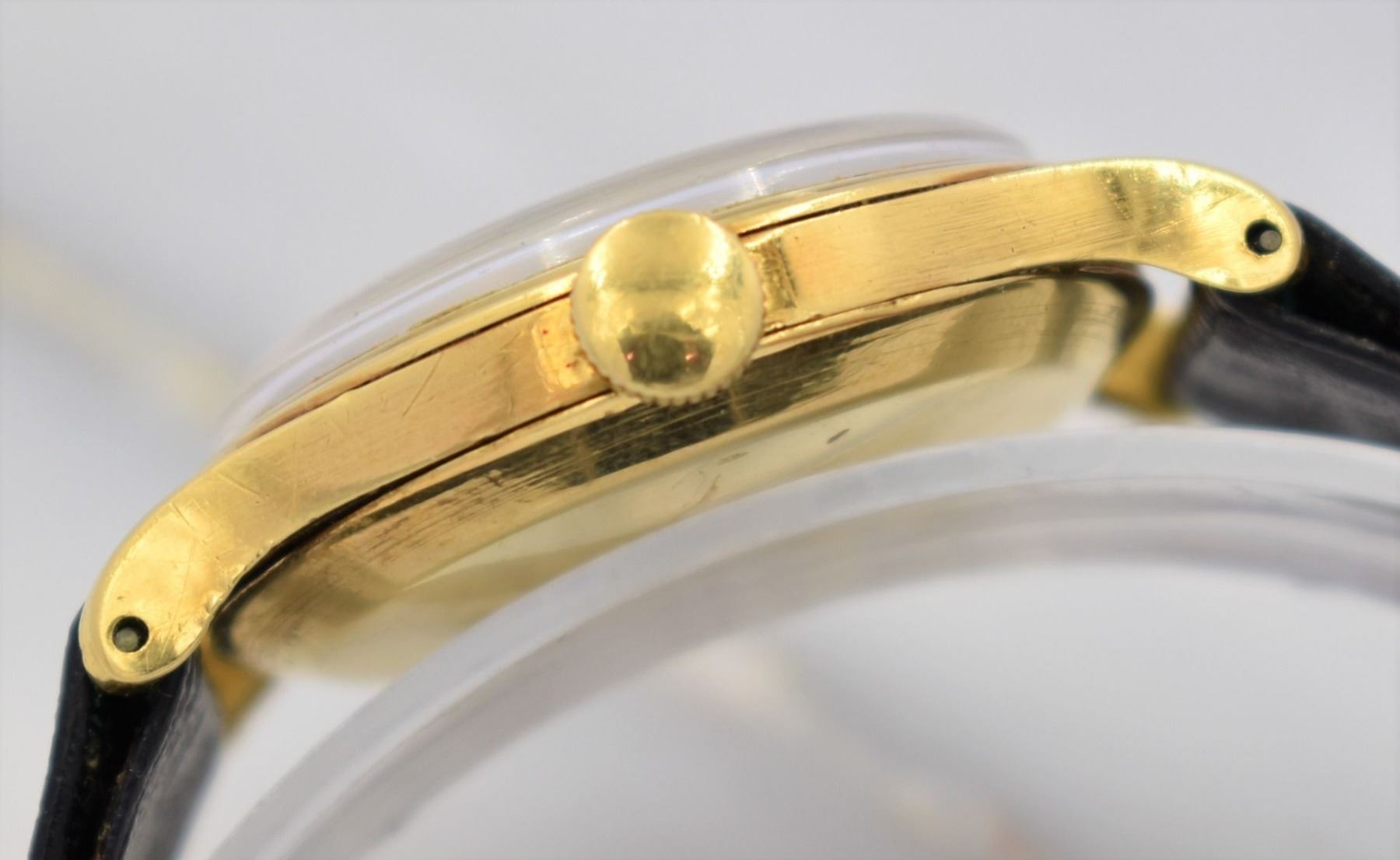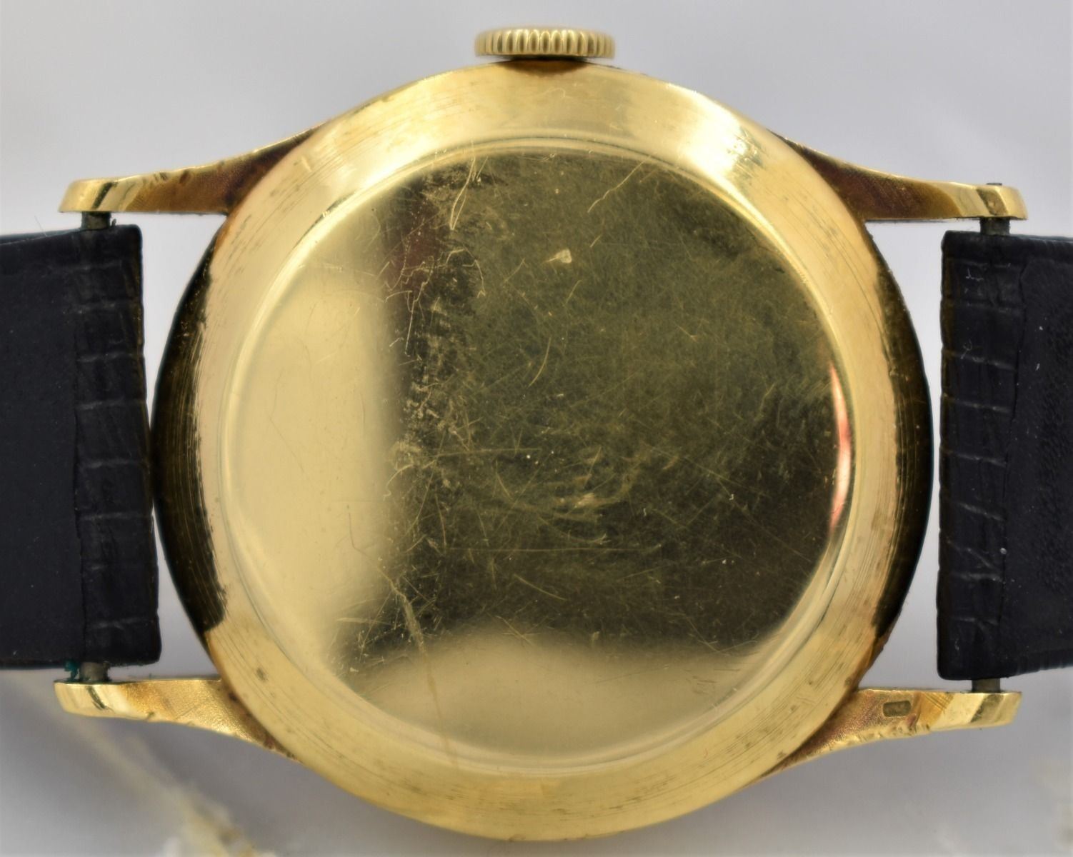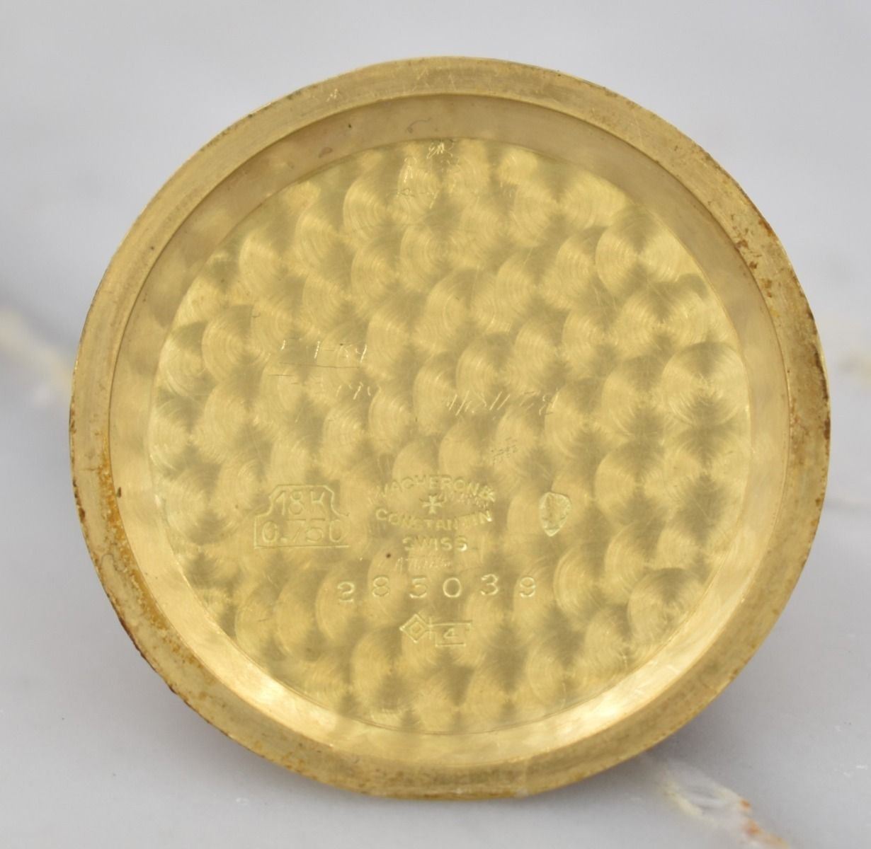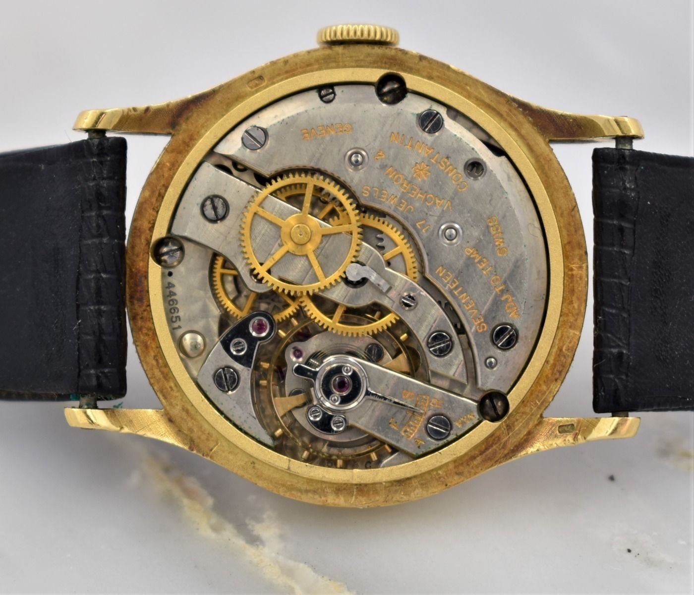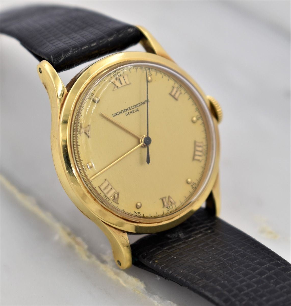 * The watch features a three piece circular 18K yellow gold case with cut lugs, snap down water-proof back that is signed Vacheron Constantin.