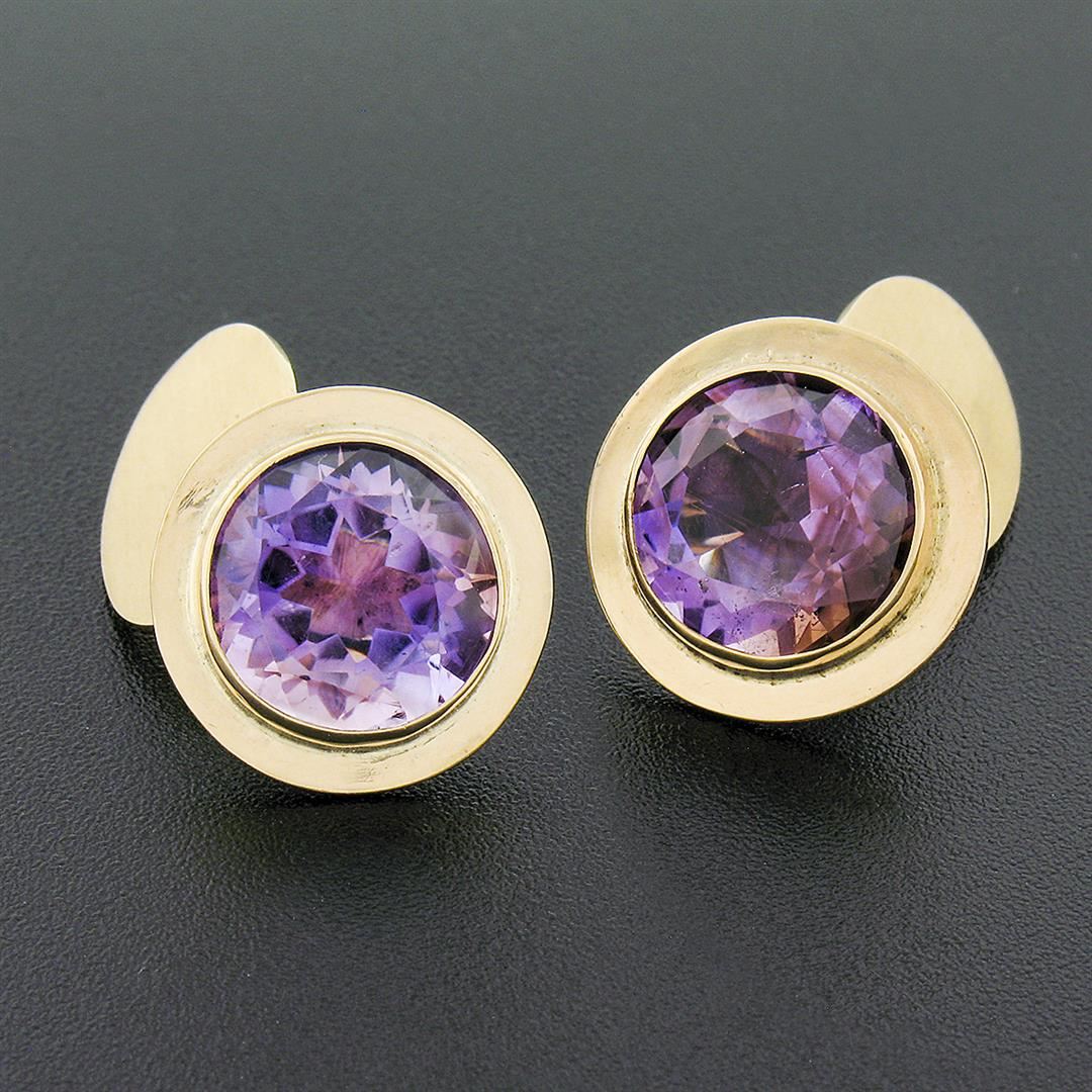A vintage solid 14k yellow gold pair of cufflinks, with 2 round cut natural amethysts (11.25mm - 8ctw). These cuff links have a chain design with a clearance of 12.50mm, weigh a total of 9.48 grams, and the front panels measure 16.65mm.