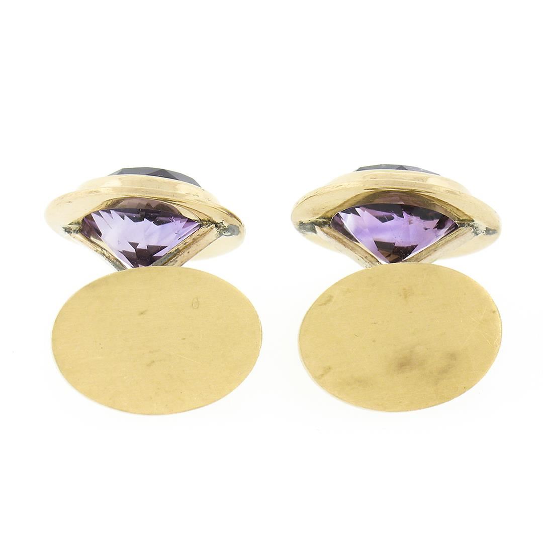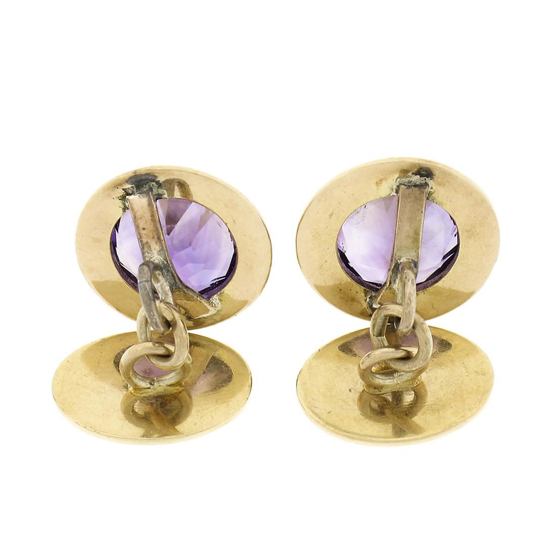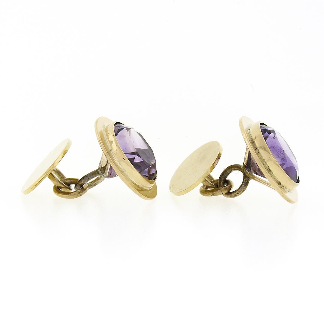 A vintage solid 14k yellow gold pair of cufflinks, with 2 round cut natural amethysts (11.25mm - 8ctw). These cuff links have a chain design with a clearance of 12.50mm, weigh a total of 9.48 grams, and the front panels measure 16.65mm.