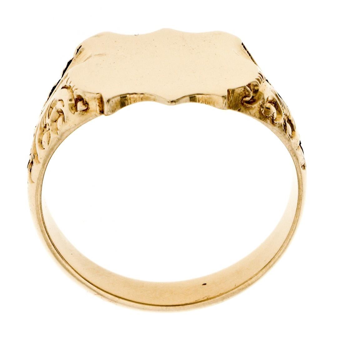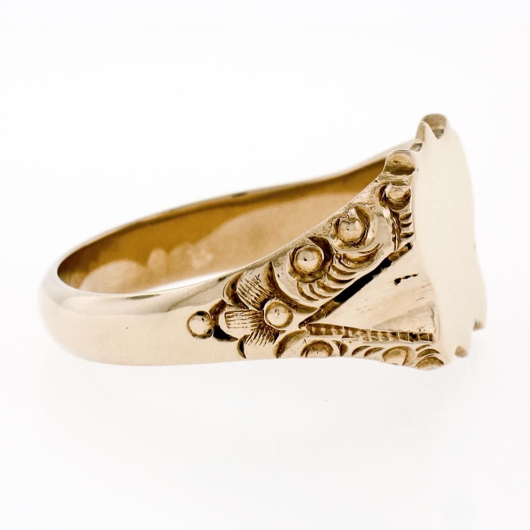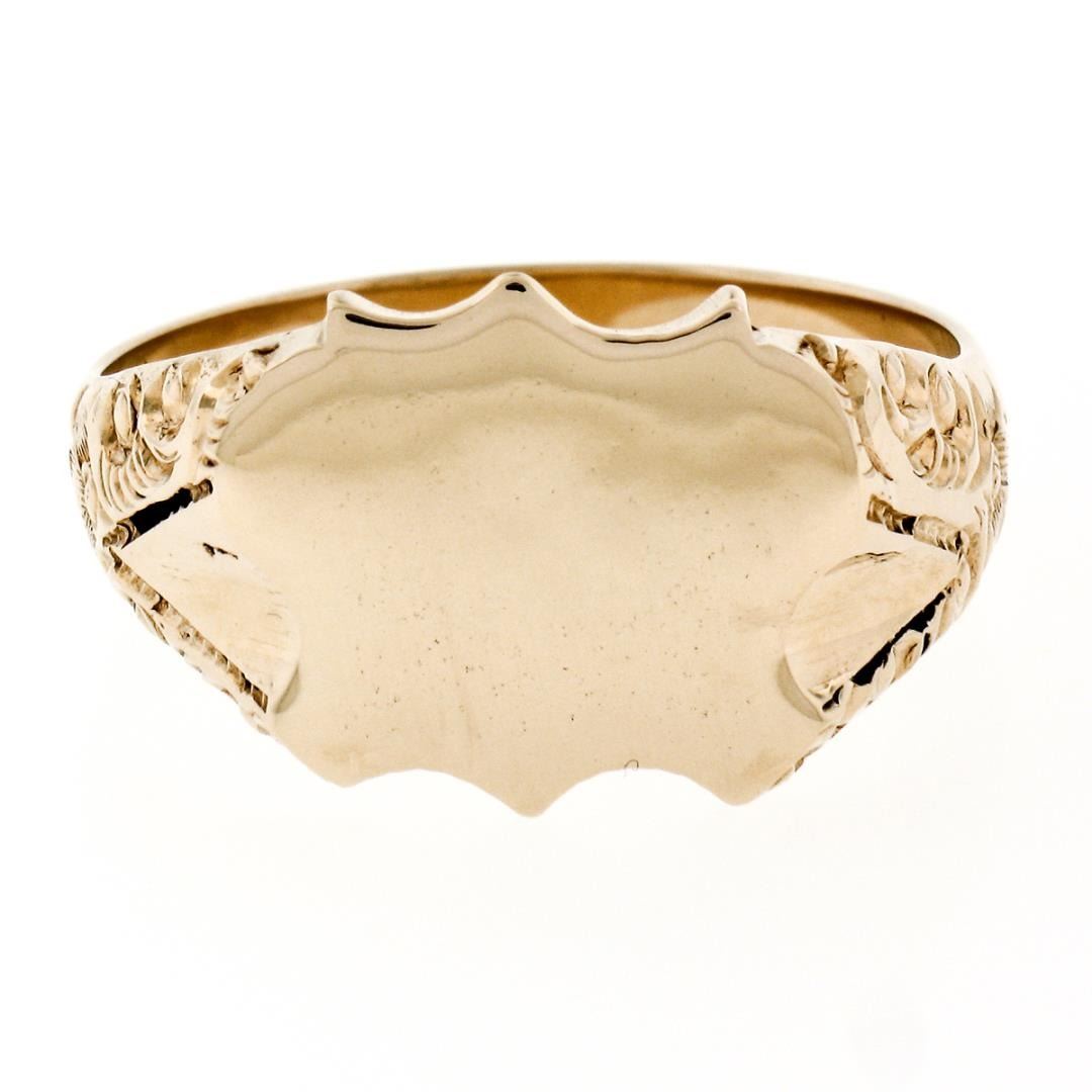 A vintage solid 14k yellow gold engraveable men's shield signet ring. The ring is size 12, weighs a total of 8.20 grams, and measures 13.60mm wide.