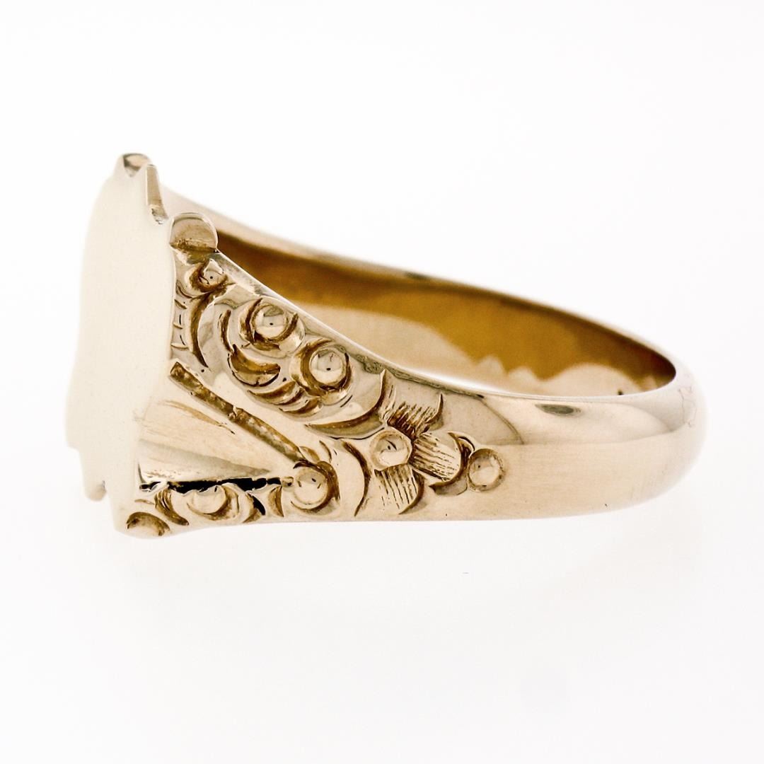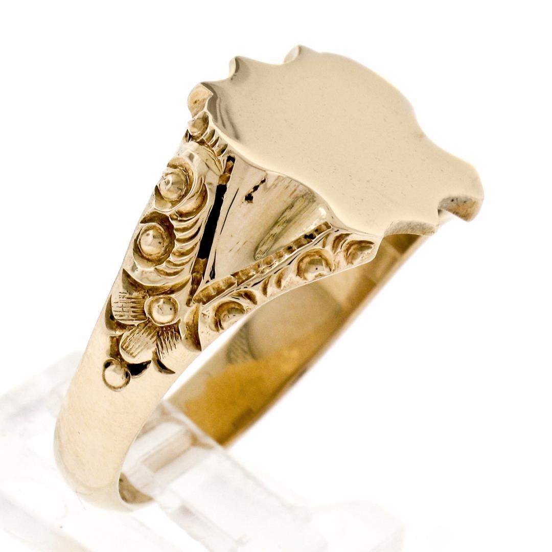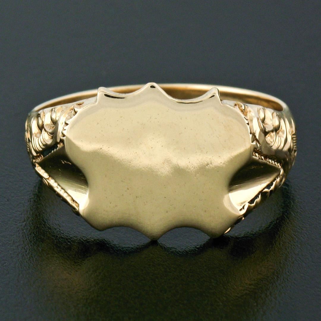 A vintage solid 14k yellow gold engraveable men's shield signet ring. The ring is size 12, weighs a total of 8.20 grams, and measures 13.60mm wide.