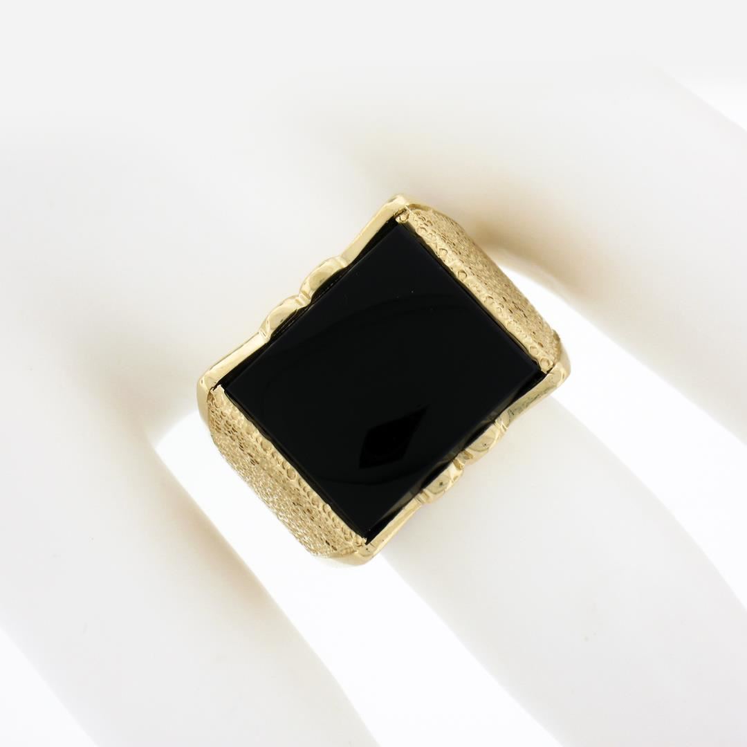 A vintage solid 14k yellow goldd wide men's ring, with 1 rectangular cut natrual black onyx (13.90x12mm). The ring is size 7.5, weighs a total of 7.46 grams, and measures 14.55mm wide.