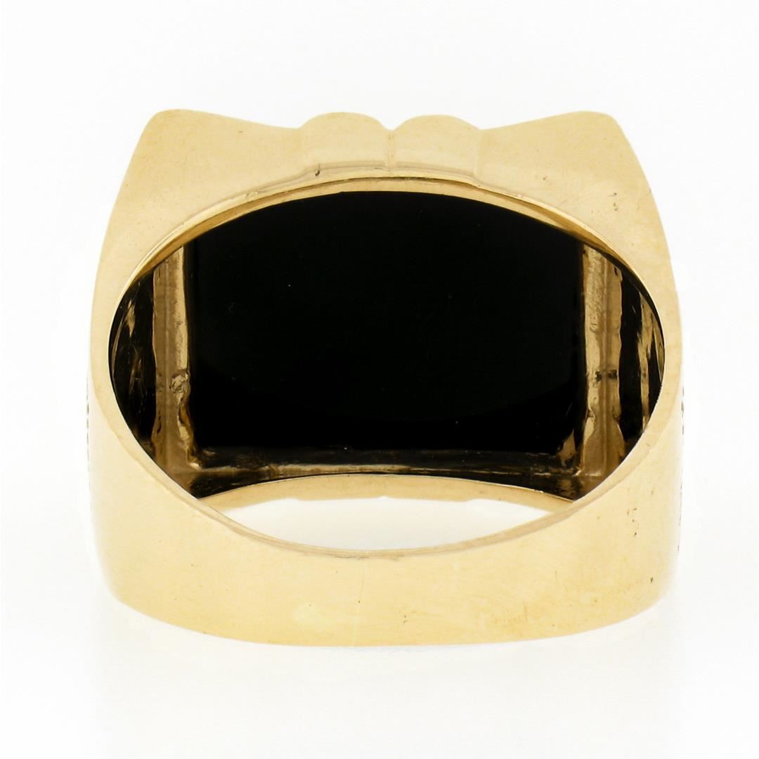 A vintage solid 14k yellow goldd wide men's ring, with 1 rectangular cut natrual black onyx (13.90x12mm). The ring is size 7.5, weighs a total of 7.46 grams, and measures 14.55mm wide.