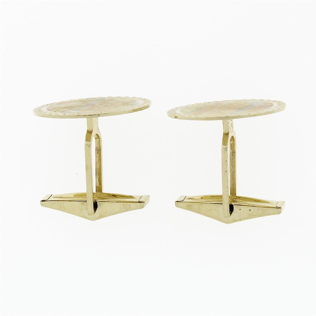 A vintage solid 14k yellow gold cufflinks. These cuff links have a swivel design with a clearance of 14.65mm, weigh a total of 8.28 grams, and the front panels measure 19.25mm.