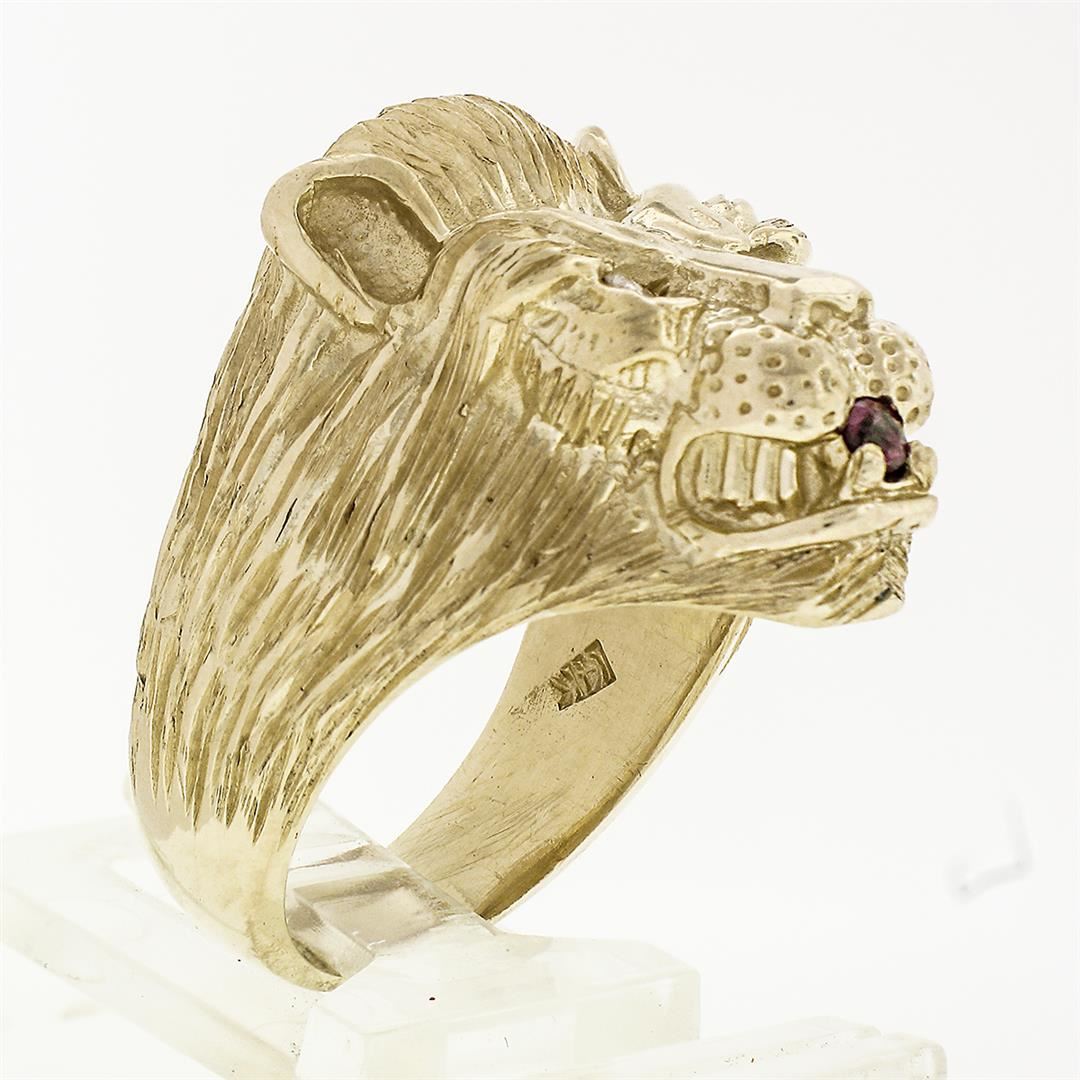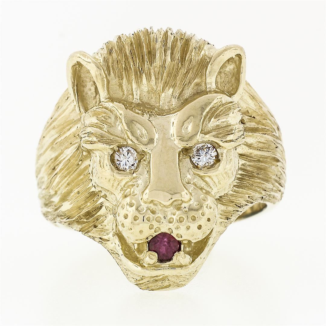 A vintage solid 14k yellow gold men's lion ring, with 2 round brilliant cut natural diamonds (H - VS1 ; 0.10ctw,) and 1 round brilliant cut natural ruby (0.07ct). The ring is size 10, weighs a total of 24.06 grams, and measures 23.97mm wide.