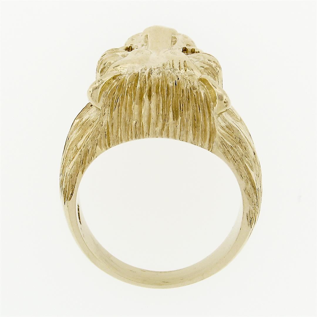 A vintage solid 14k yellow gold men's lion ring, with 2 round brilliant cut natural diamonds (H - VS1 ; 0.10ctw,) and 1 round brilliant cut natural ruby (0.07ct). The ring is size 10, weighs a total of 24.06 grams, and measures 23.97mm wide.