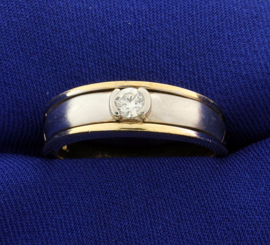 In 14k yellow gold. Contains a 1/4 ct high quality diamond with a VS clarity and G color. Size 11 1/2. 9.0g.