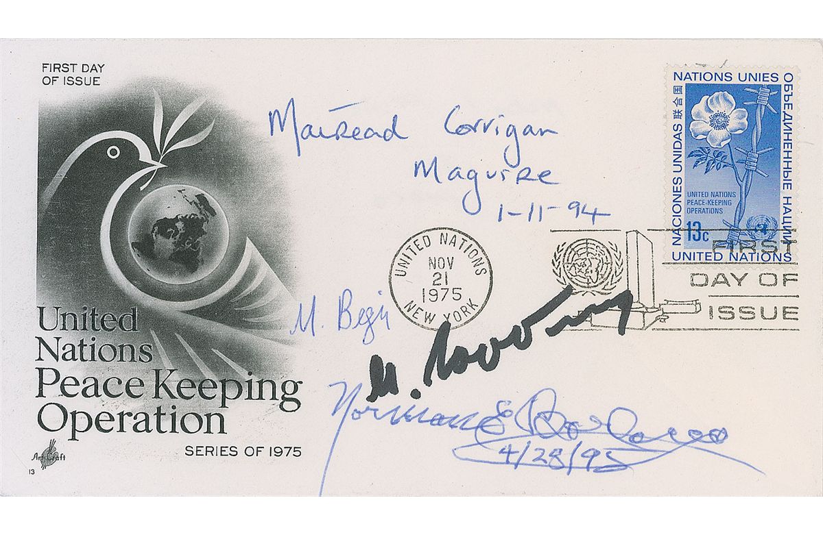 FDC with a cachet honoring the United Nations Peace Keeping Operation, signed in ballpoint and felt tip by Menachem Begin, Mikhail Gorbachev, Mairead Maguire, and Norman E. Borlaug. In fine condition.