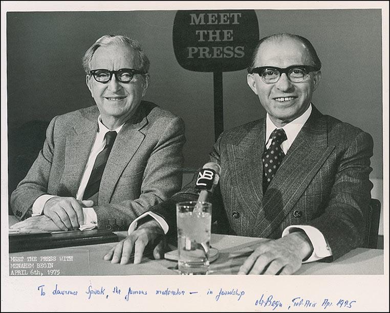 Vintage matte-finish 8 x 10 photo of Begin on Meet the Press, signed and inscribed in blue ballpoint “To Lawrence Spivak, the famous moderator—in friendship. M. Begin, Tel-Aviv, Apr 1975.” In fine condition, with some creasing. Accompanied by an unsigned Christmas card from Anwar Sadat.
