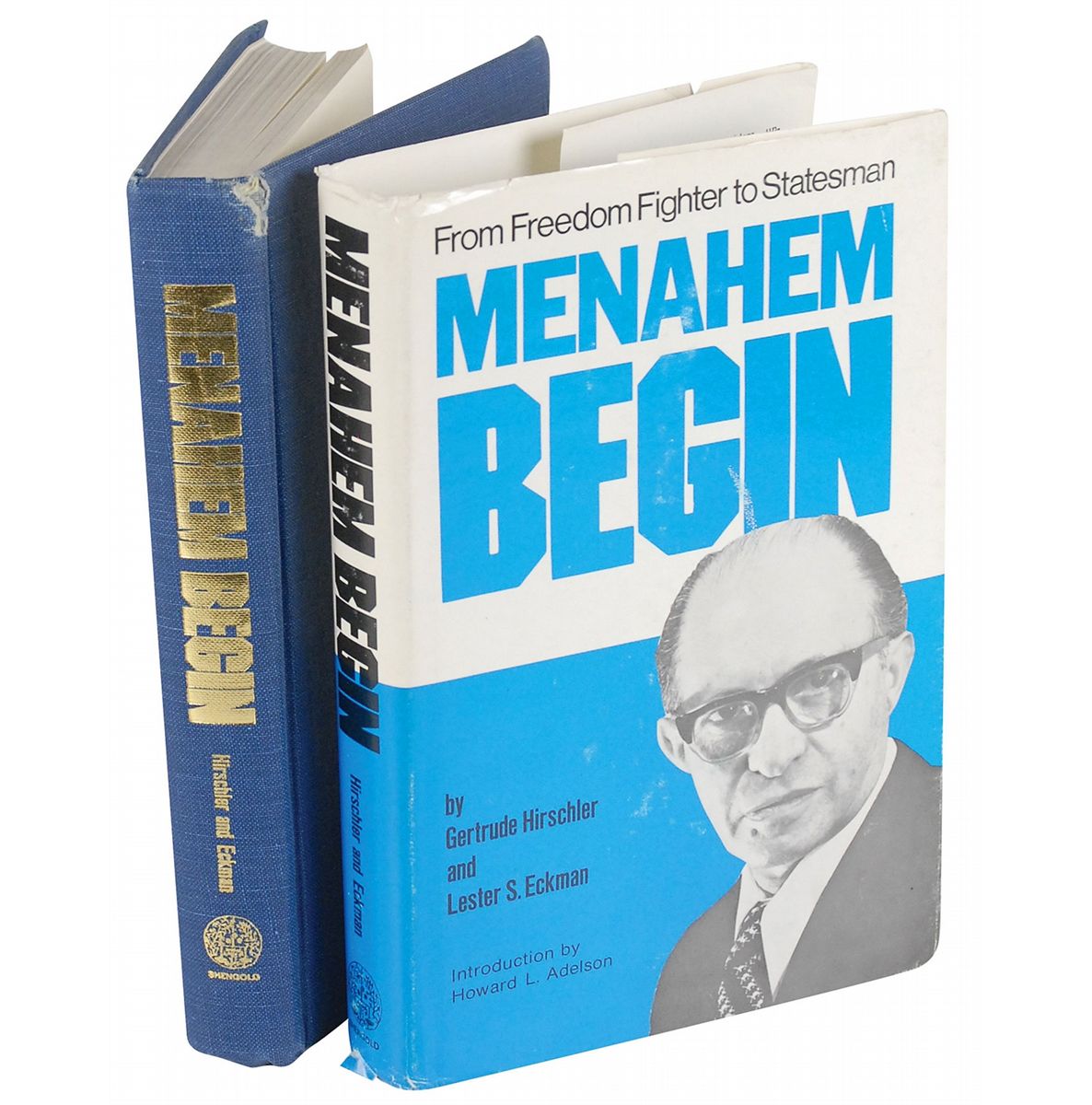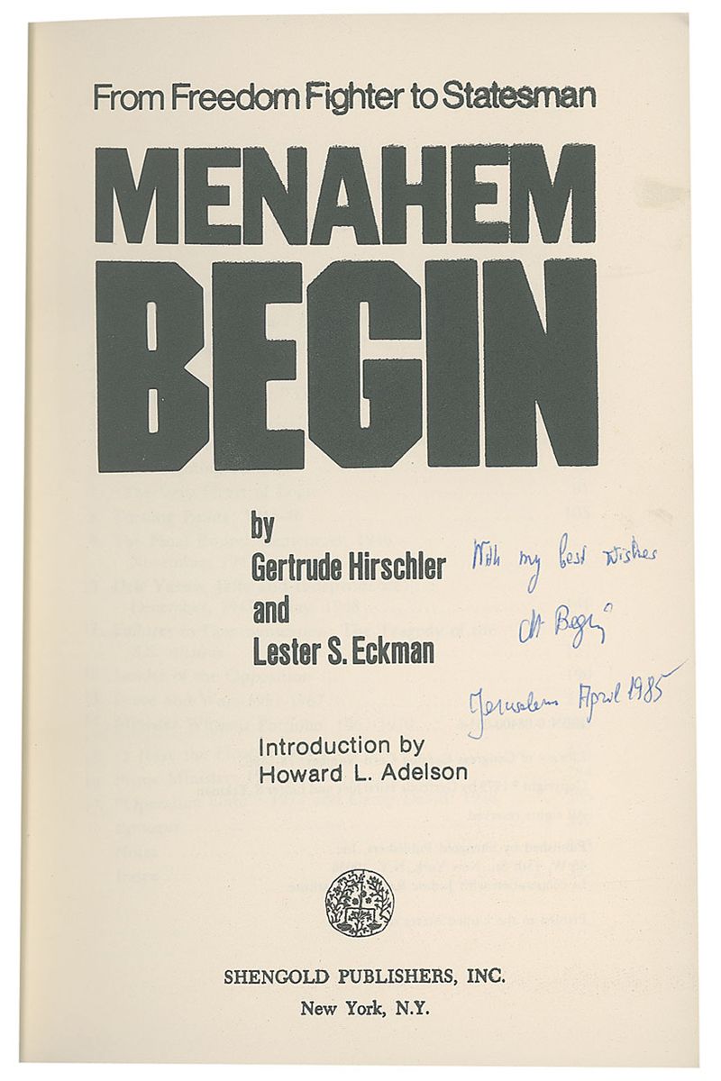 Signed book: Menachim Begin. NY: Shengold Publishers, 1979. Hardcover with dust jacket, 6.25 x 9.25, 377 pages. Signed on the title page, “With my best wishes M. Begin, Jerusalem April 1985.” In fine condition, with scattered light wear and tear to dust jacket.