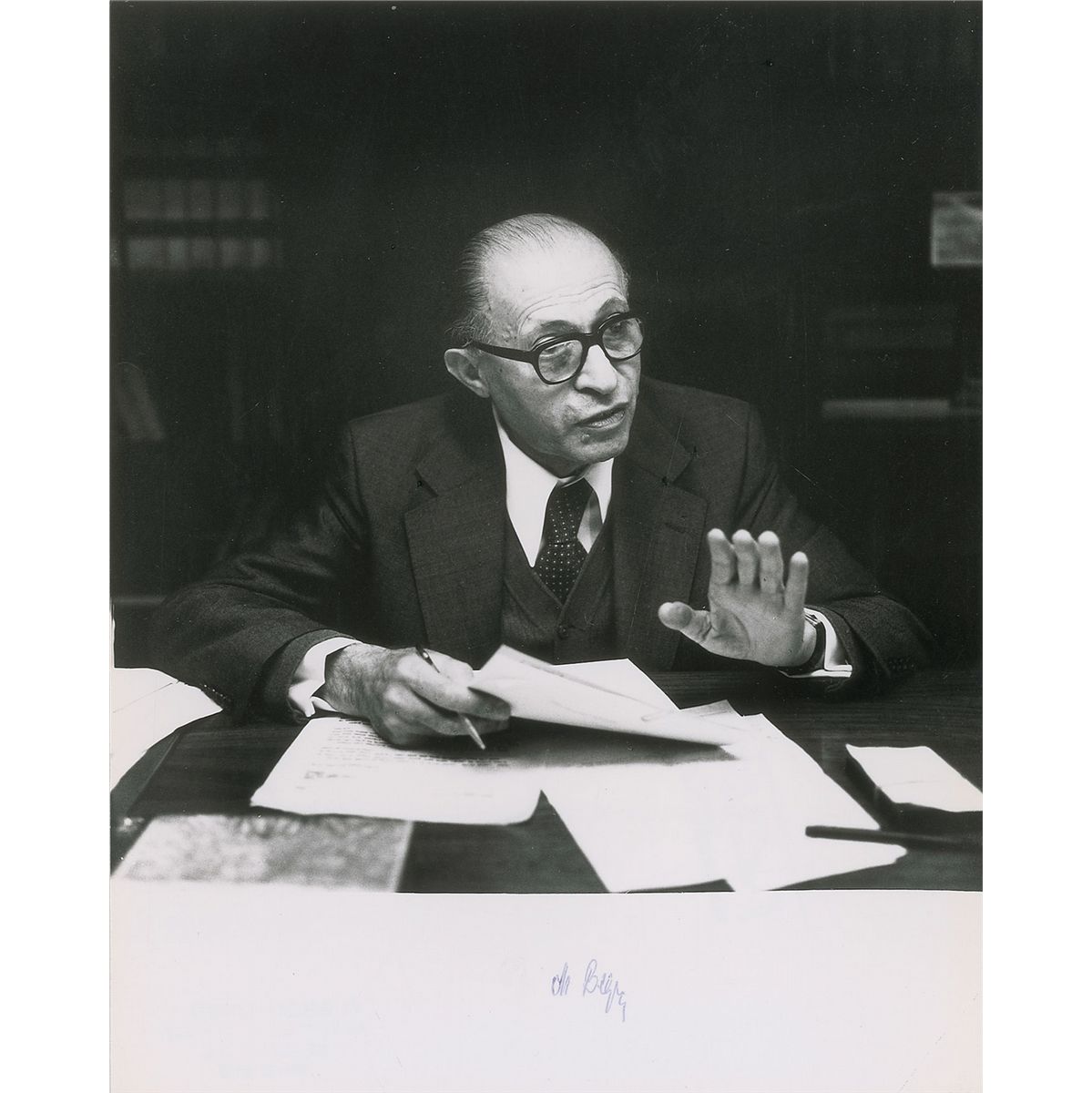 Glossy 8 x 10 photo of Begin in a meeting, signed in the lower border in blue ballpoint, “M. Begin.” Reverse bears the photographer’s stamp of Gemma Levine. In fine condition, with a bend to the lower right corner. Consignor notes that this originates from Levine’s personal collection.