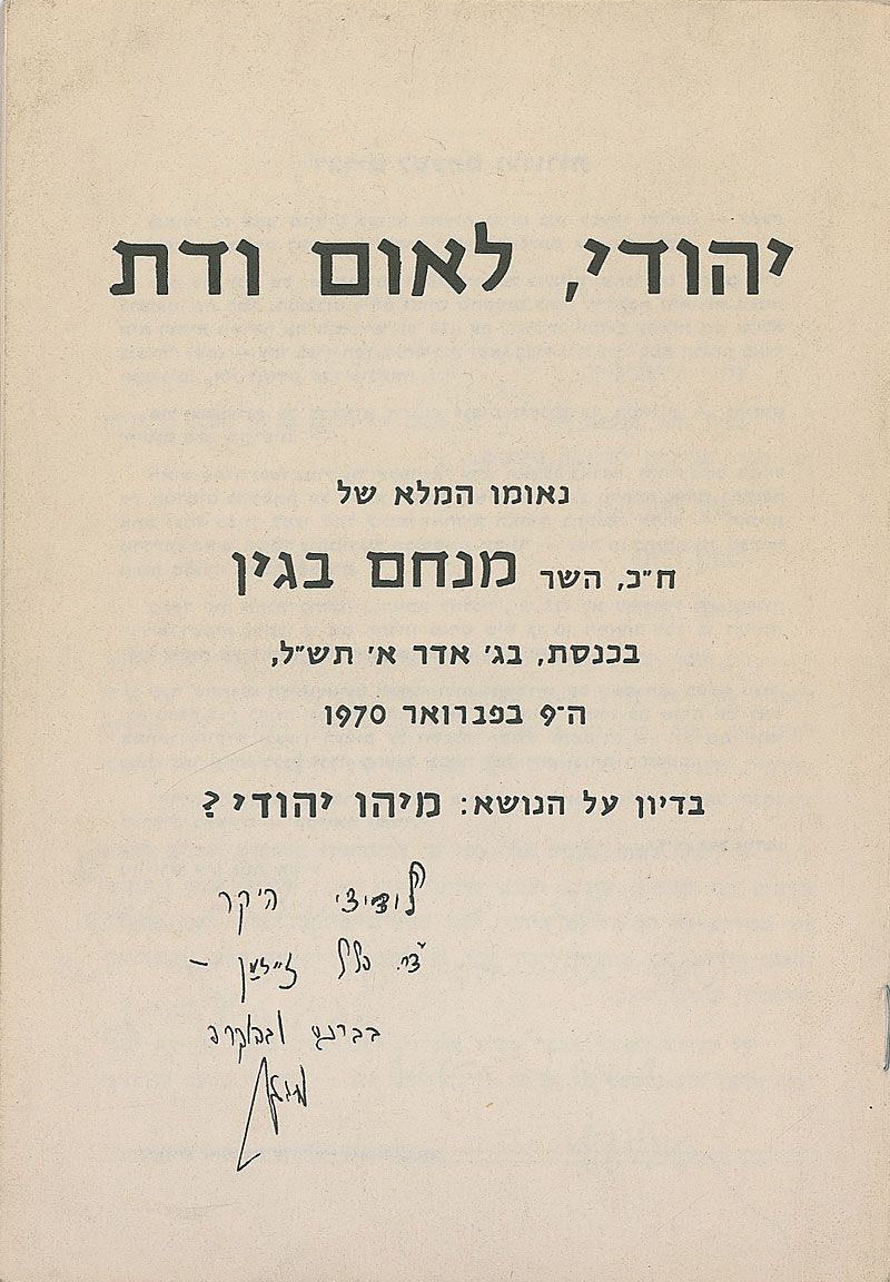 Booklet in Hebrew containing Begin’s speech in the Knesset on the controversial subject of ‘Mihu Yehudi,’ 1970, 5.25 x 7.75, 16 pages, signed and inscribed on the front cover in Hebrew in black ink to writer Hillel Zeidman. In fine condition, with a few light creases and some writing to one page inside. ‘Mihu Yehudi’—translated, essentially, as ‘Who is a Jew?’—is a controversial but basic question about Jewish identity and considerations of Jewish self-identification. It is a source of disagreement between various branches of Judaism, where there are conflicting ideas about the validity of conversion, the effect of mixed parents, diasporic identity, and claims to Israeli citizenship.