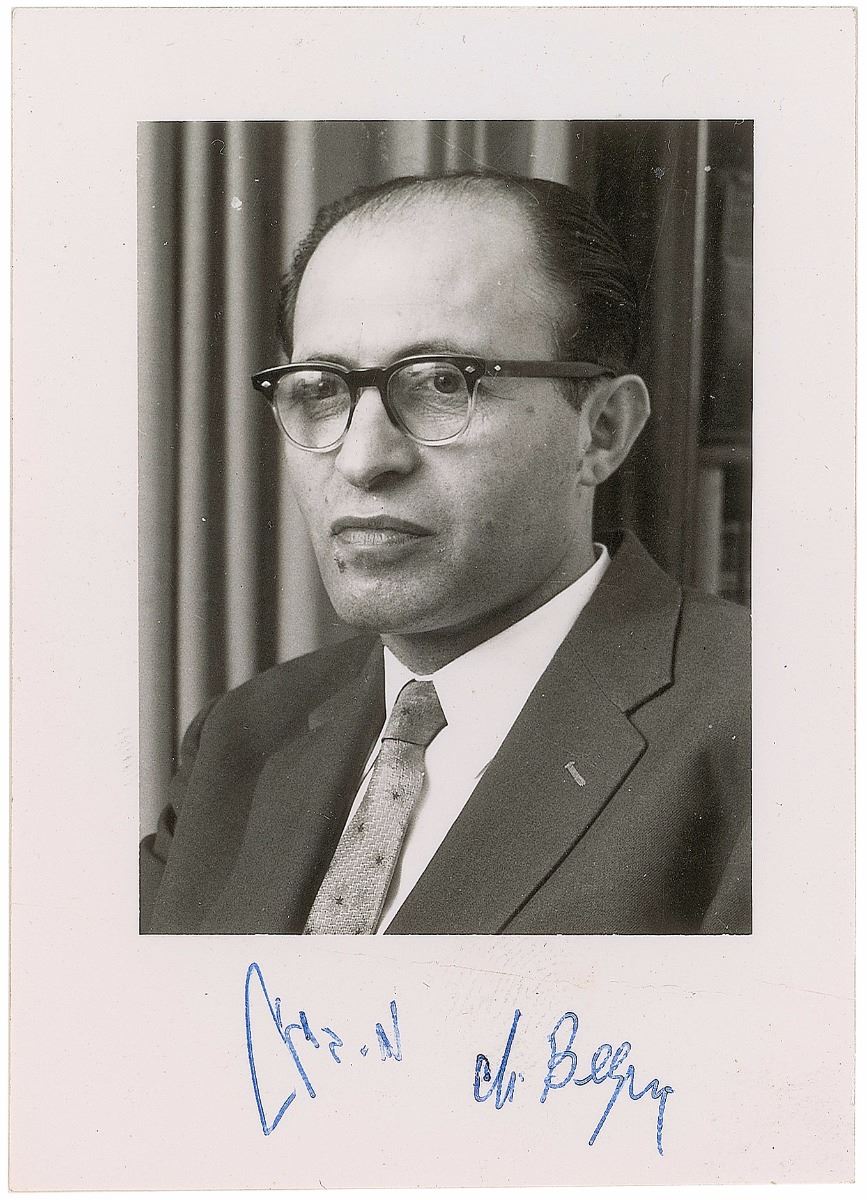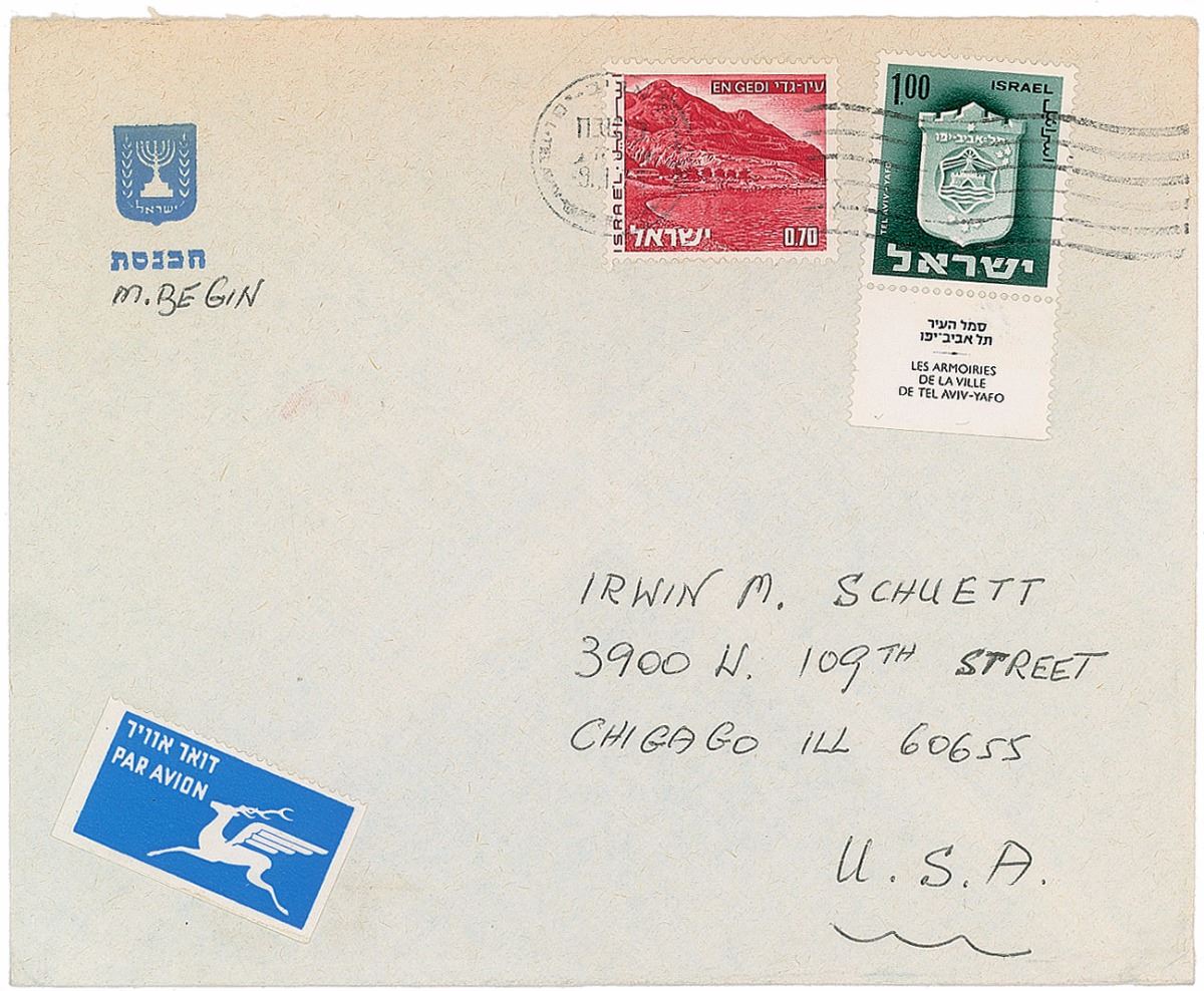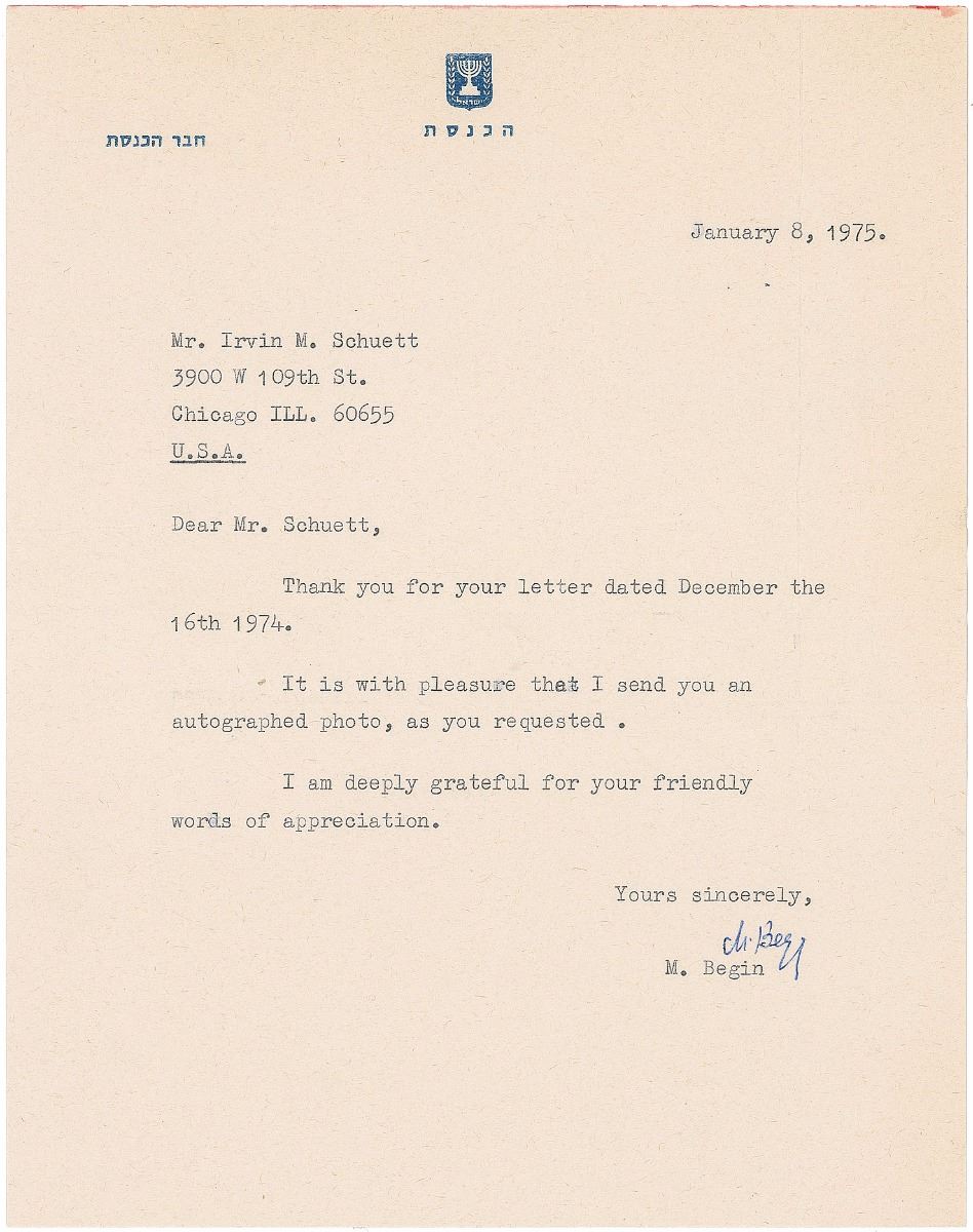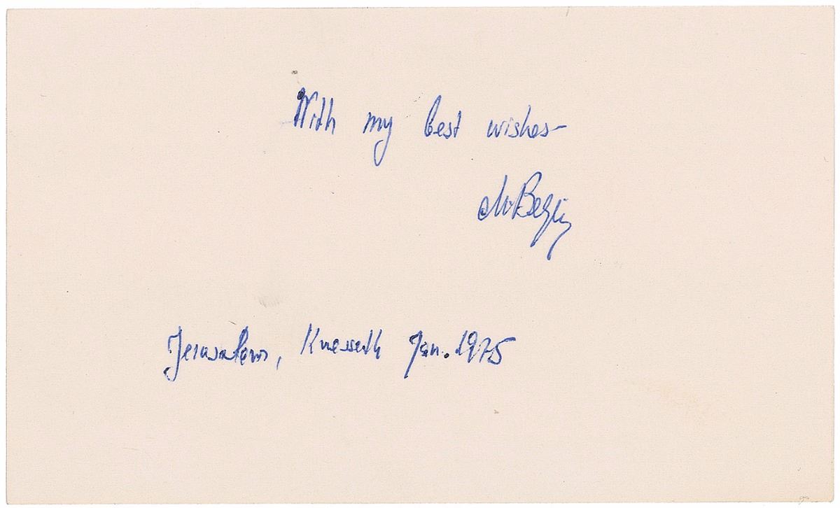 Three items: a glossy 2.5 x 3.5 photo of Begin, signed in the lower border in blue ballpoint, “M. Begin”; a ballpoint signature, “With my best wishes, M. Begin, Jerusalem, Knesseth, Jan. 1975,” on an off-white 5 x 3 card; and a TLS signed “M. Begin,” one page, 6.5 x 8.25, January 8, 1975, in full: “Thank you for your letter dated December the 16th 1974. It is with pleasure that I send you an autographed photo, as you requested. I am deeply grateful for your friendly words of appreciation.” Intersecting folds (one vertical fold passing through a single letter of the signature) and creasing to the letter, and a horizontal crease and surface impressions to the photo, otherwise overall fine condition. Accompanied by an original mailing envelope.