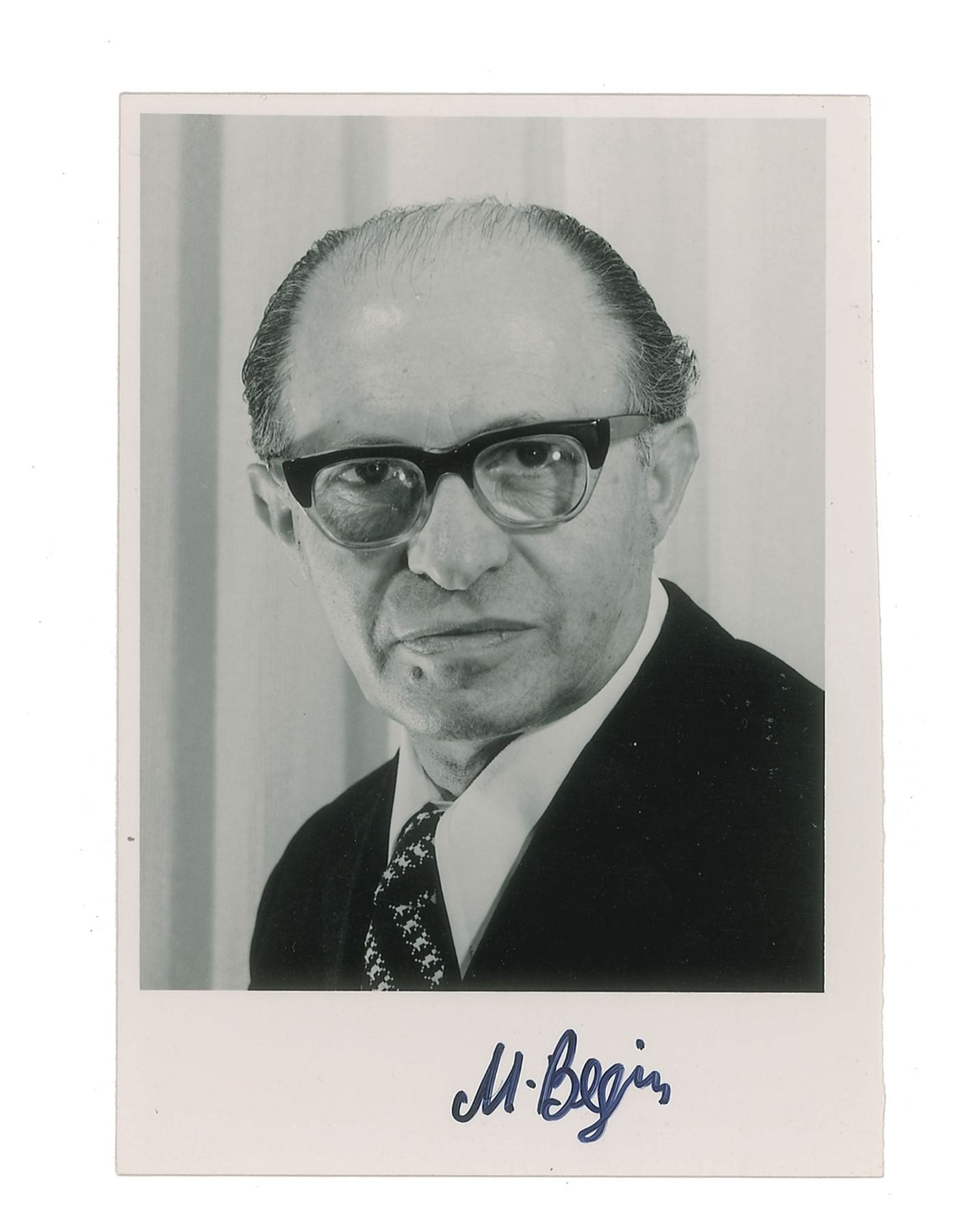 Glossy 3.5 x 5 head-and-shoulders photo of Begin as prime minister of Israel, signed in the lower border in black felt tip, "M. Begin." In fine condition. Accompanied by the original mailing envelope and transmittal slip.
