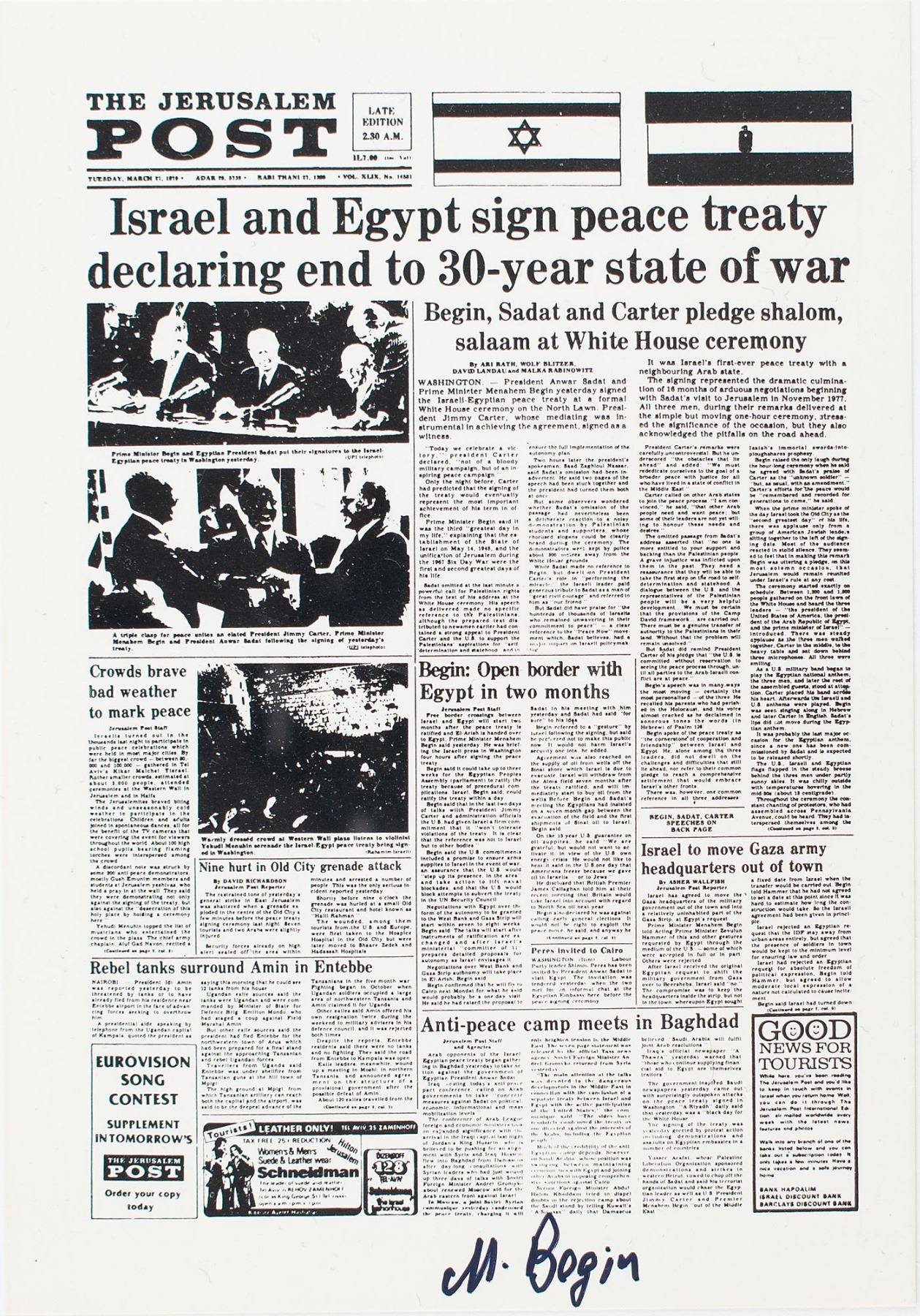 Glossy 4.75 x 6.75 postcard with an image of The Jerusalem Post from March 27, 1979, with headline, "Israel and Egypt sign peace treaty declaring end to 30-year state of war," signed in the lower border in black felt tip, "M. Begin." In very fine condition. In 1978, President Carter hosted Egyptian President Anwar Sadat and Israeli Prime Minister Menachem Begin at Camp David for clandestine peace talks. Six months later, on March 26, 1979, Begin and Sadat met in Washington, D.C., to sign the Egypt-Israel Peace Treaty, for which the two won the Nobel Peace Prize.