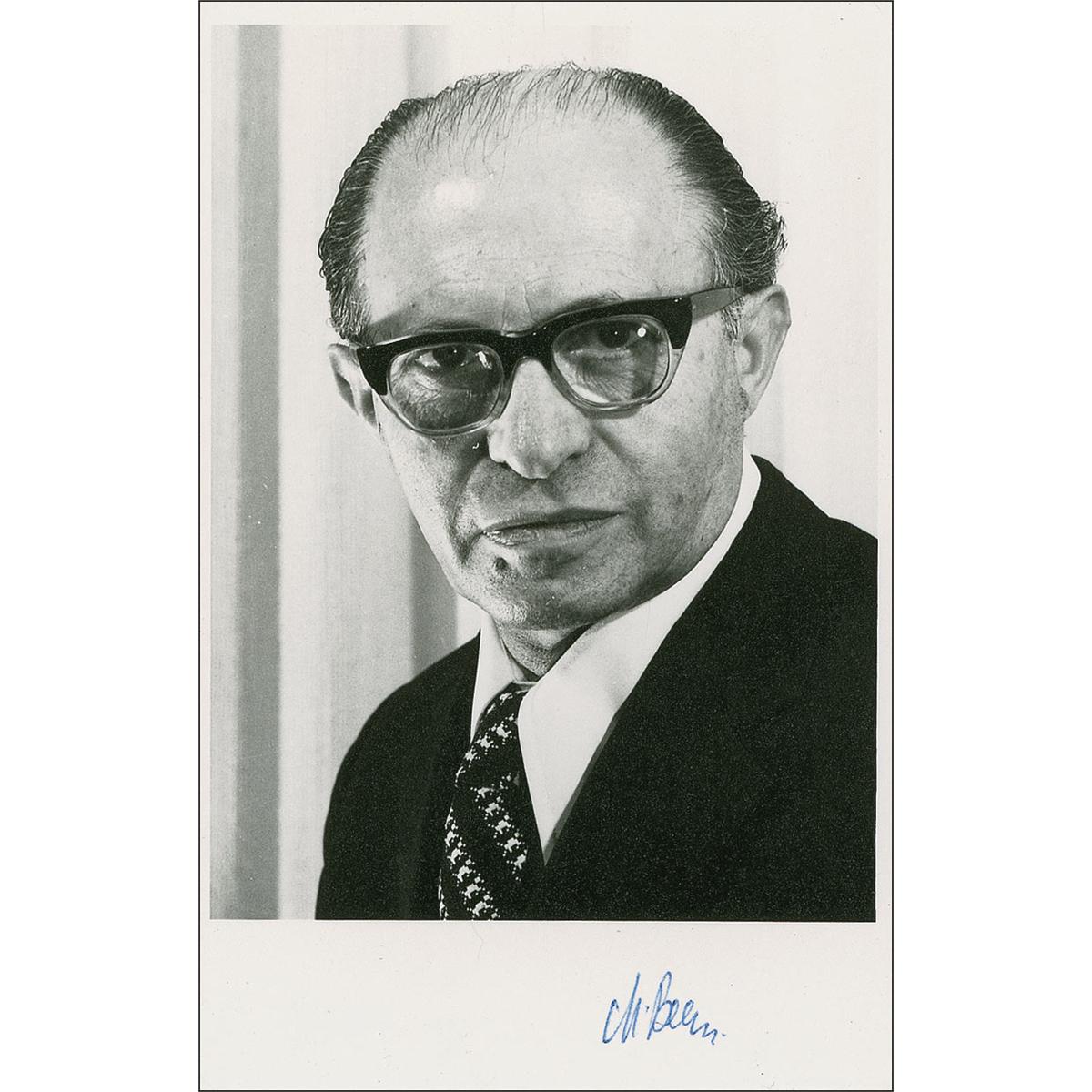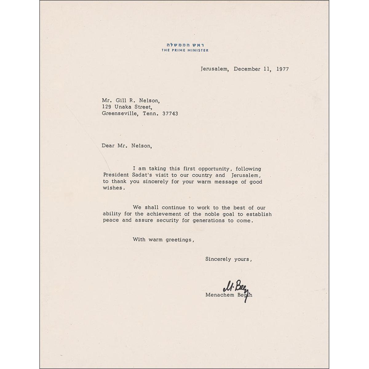 Matte-finish 3.5 x 5.5 photo of Begin, signed in the lower border in blue ballpoint, “M. Begin”; and a one-page TLS, signed “M. Begin,” 8.5 x 11, Prime Minister letterhead, dated December 11, 1977, reading, in part: “I am taking this first opportunity, following President Sadat’s visit to our country and Jerusalem, to thank you sincerely for your warm message of good wishes.” In fine condition, with binder dings to left edge of letter.
