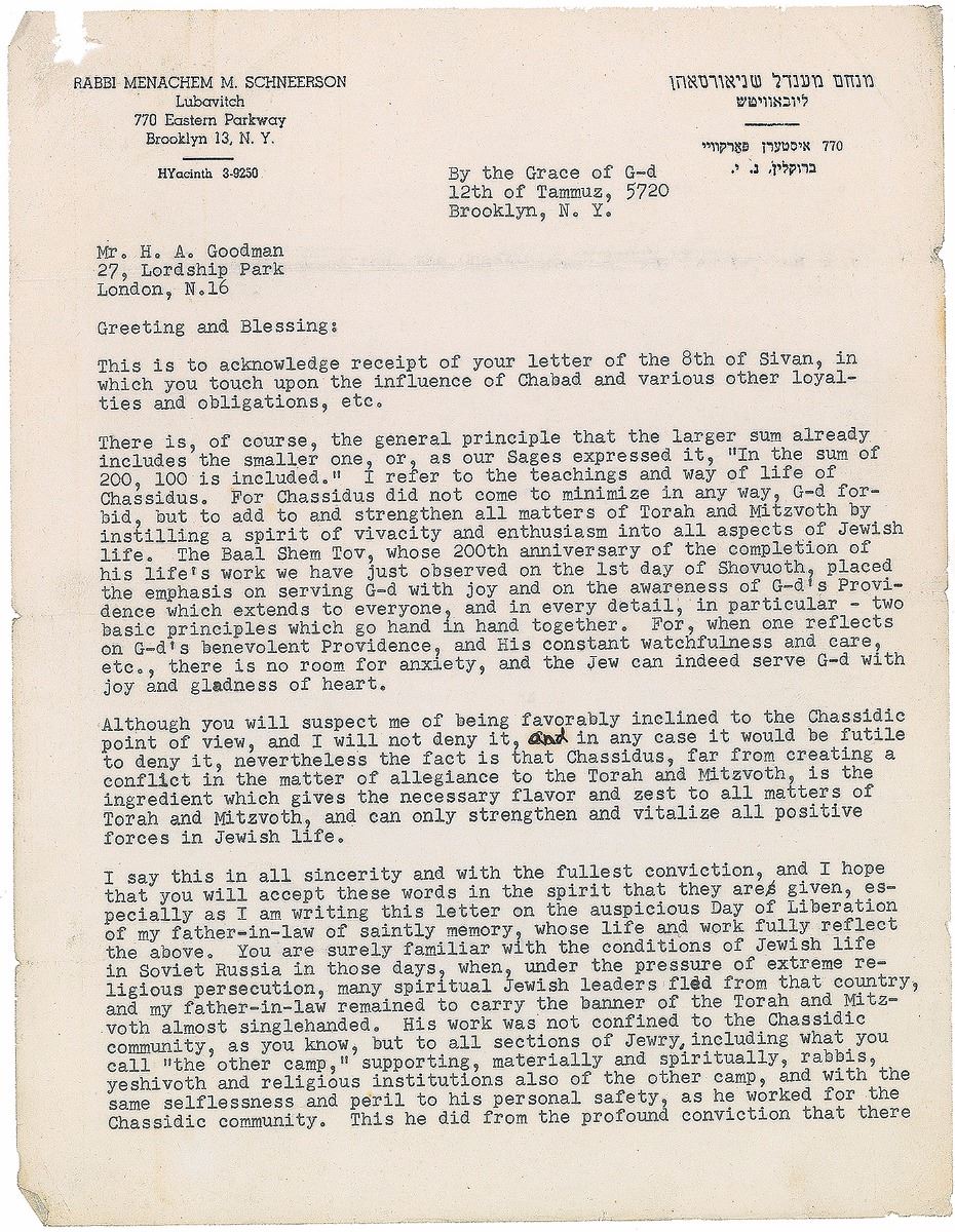 Orthodox rabbi (1902–1994) who led the Chabad-Lubavitch movement and is considered one of the most influential Jewish figures of the 20th century. TLS signed “M. Schneerson,” three onionskin pages, 8.5 x 11, personal letterhead, July 7, 1960. Lengthy letter to H. A. Goodman of London touching upon several areas of Jewish interest. In part: “There is, of course, the general principle that the larger sum already includes the smaller one, or, as our Sages expressed it, 'In the sum of 200, 100 is included.' I refer to the teachings and way of life of Chassidus. For Chassidus did not come to minimize in any way, G-d forbid, but to add to and strengthen all matters of Torah and Mitzvoth by instilling a spirit of vivacity and enthusiasm into all aspects of Jewish life. The Baal Shem Tov, whose 200th anniversary of the completion of his life's work we have just observed on the 1st day of Shovuoth, placed the emphasis on serving G-d with joy and on the awareness of G-d's Providence which extends to everyone, and in every detail, in particular—two basic principles which go hand in hand together. For, when one reflects on G-d's benevolent Providence, and His constant watchfulness and care, etc., there is no room for anxiety, and the Jew can indeed serve G-d with joy and gladness of heart.