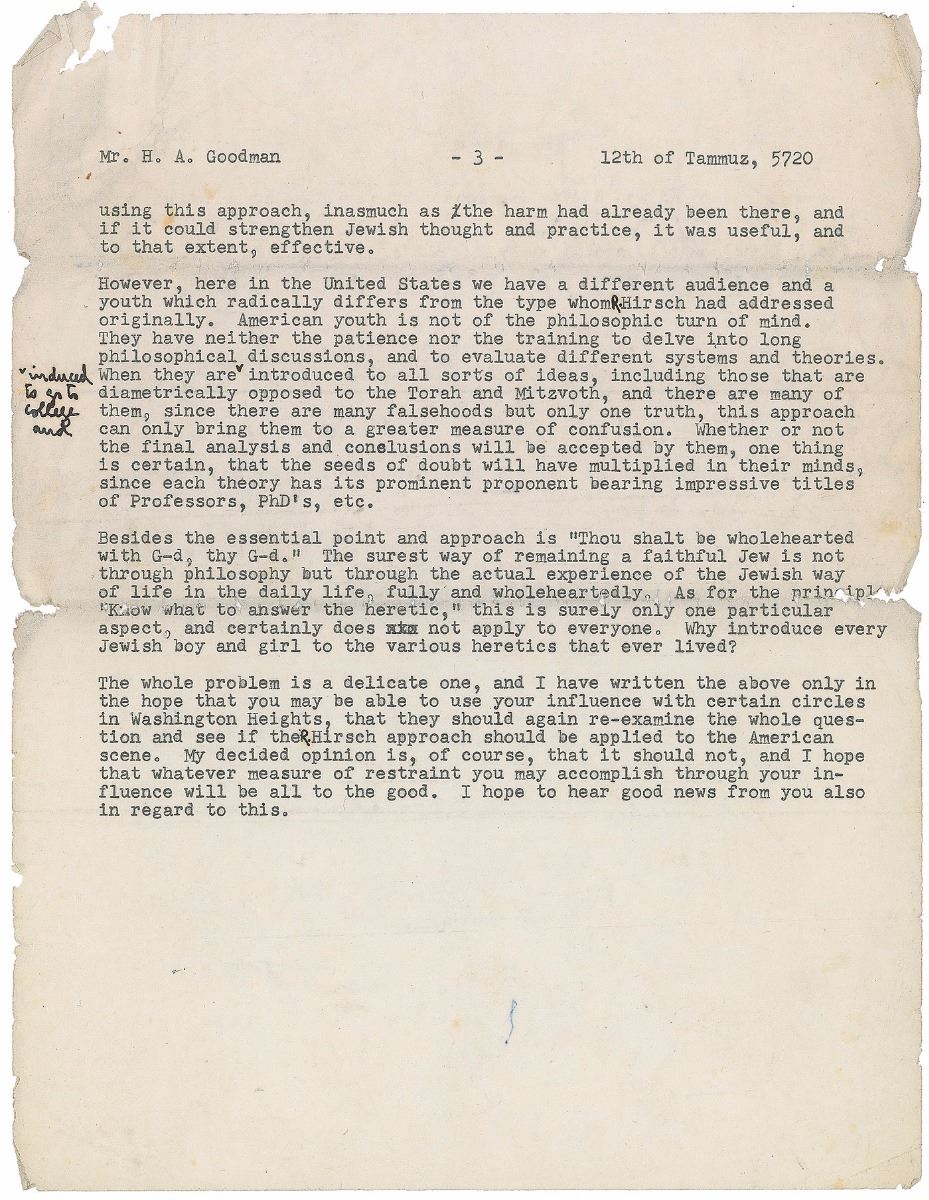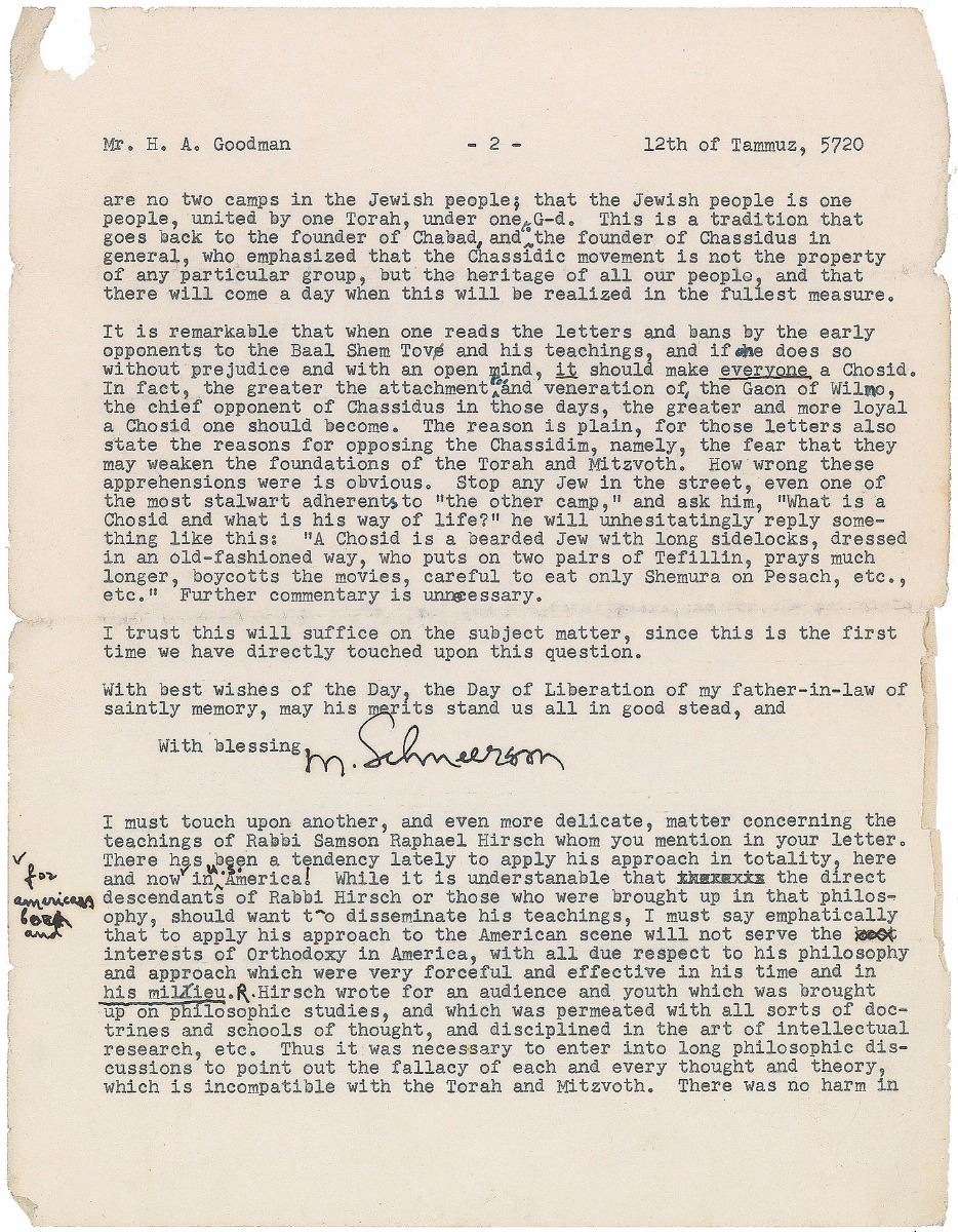 It is remarkable that when one reads the letters and bans by the early opponents to the Baal Shem Tove and his teachings, and if one does so without prejudice and with an open mind, it should make everyone a Chosid. In fact, the greater the attachment to and veneration of, the Gaon of Wilno, the chief opponent of Chassidus in those days, the greater and more loyal a Chosid one should become. The reason is plain, and for those letters also state the reasons for opposing the Chassidim, namely the fear that they may weaken the foundations of the Torah and Mitzvoth. How wrong these apprehensions were is obvious. Stop any Jew in the street, even one of the most stalwart adherents to 'the other camp,' and ask him, 'What is a Chosid and what is his way of life?' he will unhesitatingly reply something like this: 'A Chosid is a bearded Jew with long sidelocks, dressed in an old-fashioned way, who puts on two pairs of Tefillin, prays much longer, boycotts the movies, careful to eat only Shemura on Pesach, etc., etc.' Further commentary is unnecessary. I trust this will suffice on the subject matter, since this is the first time we have directly touched upon this question.” Schneerson adds several handwritten corrections throughout the text. In very good to fine condition, with some tiny holes to text caused by typewriter, partial separations along edges of folds, and staple-related paper loss to upper left corners. A rare letter with superlative content.
