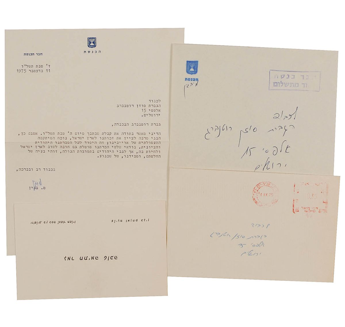 TLS in Hebrew, signed “M. Begin,” one page, 6.5 x 8.25, Knesset letterhead, 1975. Letter regarding Zionist propaganda abroad and the homecoming of Jews to Israel. In fine condition, with a single horizontal and vertical mailing fold. Accompanied by the original mailing envelope. Also included is a calligraphed formal Shana Tova card of Menachem and Aliza Begin and 10 color candid photos, 4.75 x 3, of Begin's 1977 visit to Tanenbaum Center.