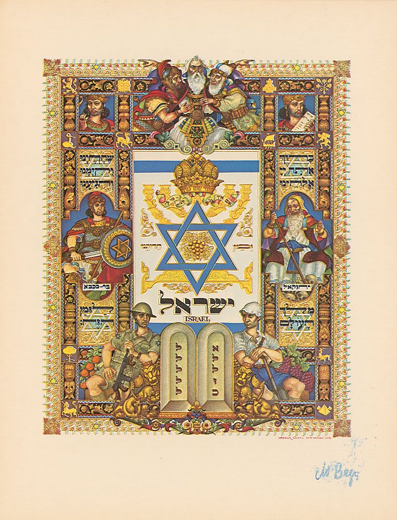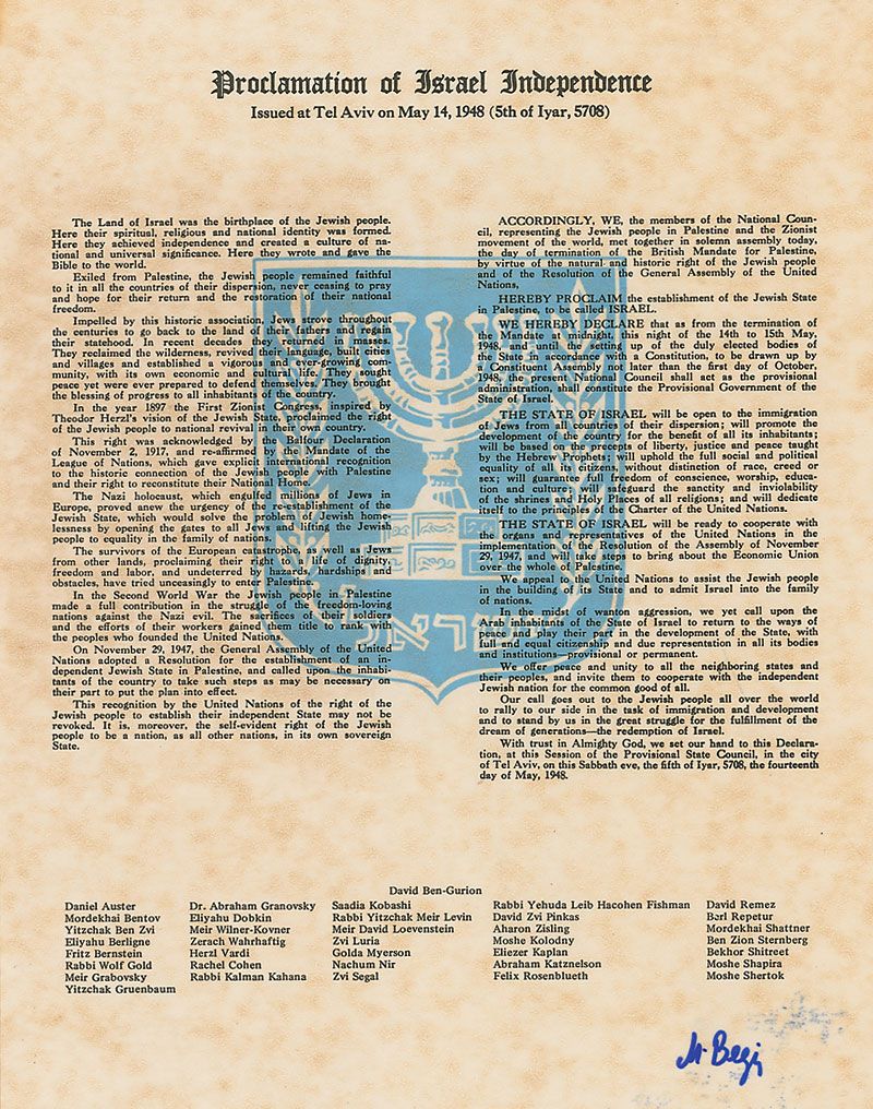 Souvenir copy of the Proclamation of Israel Independence issued on May 14, 1948, signed at the bottom in blue felt tip, “M. Begin.” In very fine condition. Accompanied by the original mailing envelope.