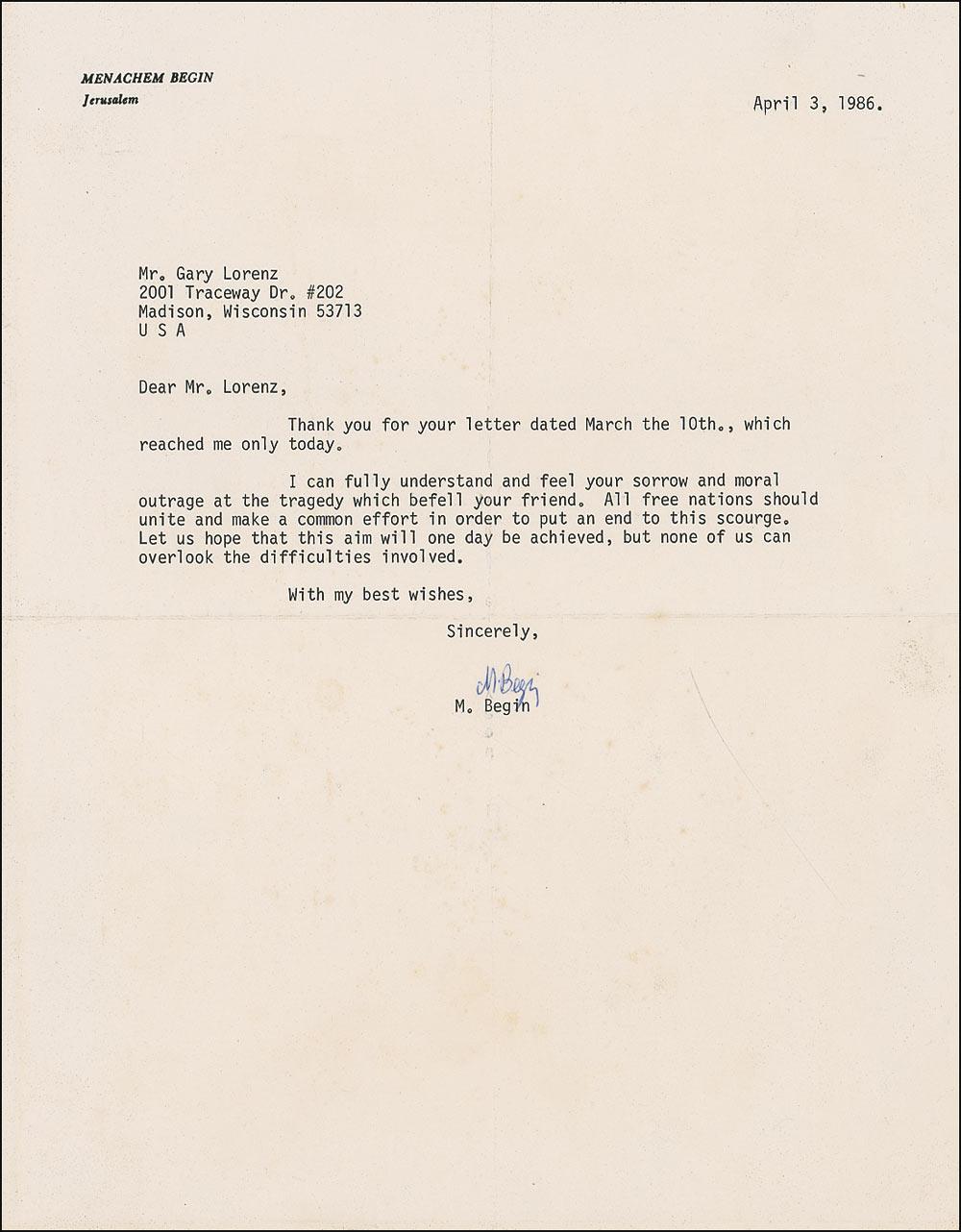 Two items: TLS, signed “M. Begin,” one page, 8.5 x 11, personal letterhead, dated April 3, 1986. Begin writes to the friend of a victim of an unknown tragedy. In part: “I can fully understand and feel your sorrow and moral outrage at the tragedy which befell your friend. All free nations should unite and make a common effort in order to put an end to this scourge. Let us hope that this aim will one day be achieved, but none of us can overlook the difficulties involved.”; and a glossy 3.5 x 5 photo of Begin, signed in the lower border in blue felt tip, “M. Begin.” In fine condition, with bisecting folds to letter, with vertical fold through first initial of signature, as well as some scattered light creases. RRAuction COA.
