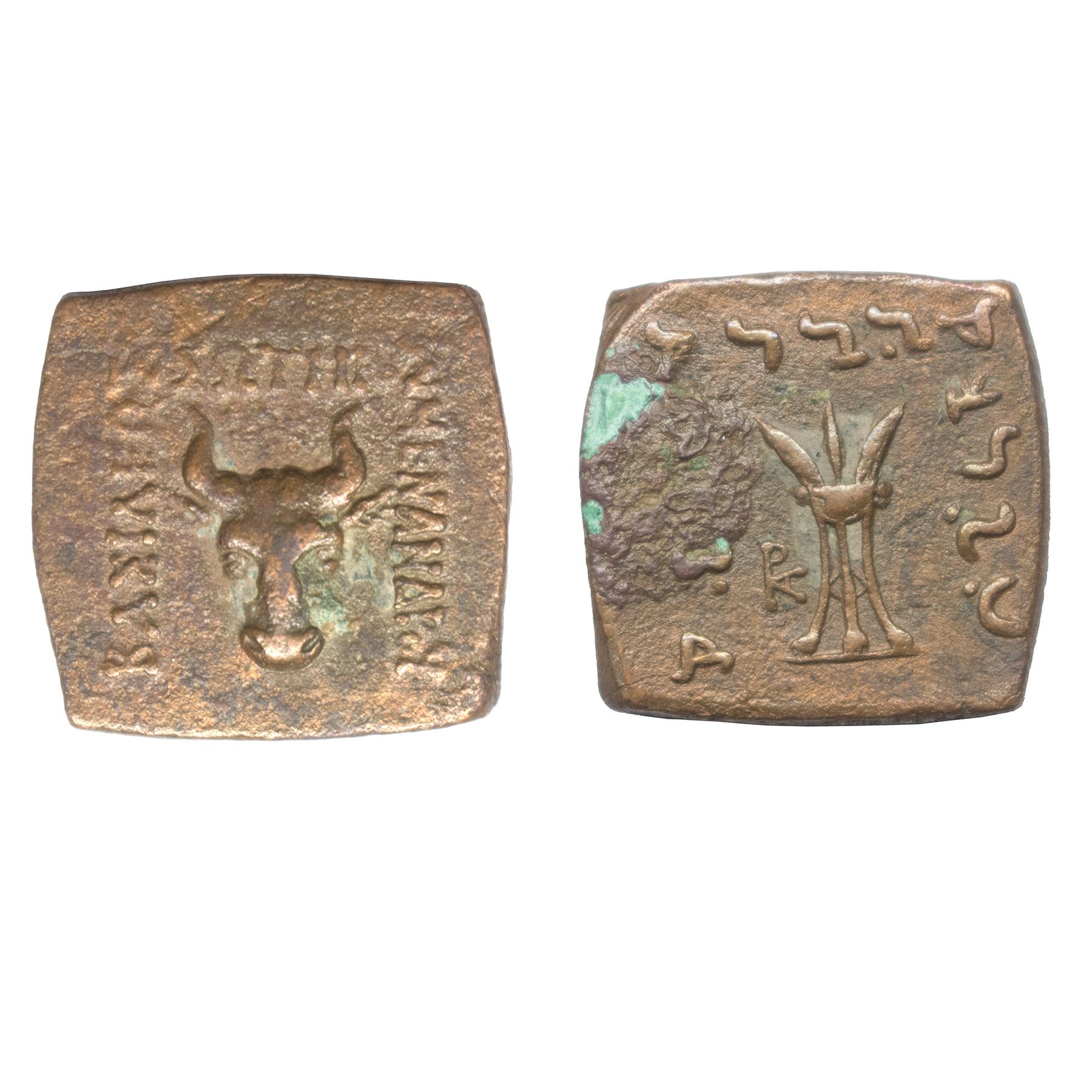 Menander - copper square Octople Weight 20.92grms, Head of bull facing, Greek legend on three sides: BA?I?E?? ??THPO? MENAN?POY, Tripod, monogram at left, Kharoshthi legend on three sides: maharajasa tratarasa menamdrasa, Reference: MIG 233a, Bop 29A. Very fine