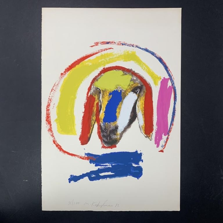 Menashe Kadishman's "Sheep Head" limited edition print, signed and dated and numbered 95/100 lower middle. This piece is of a sheep's head, with colour around it. This piece is in excellent condition.